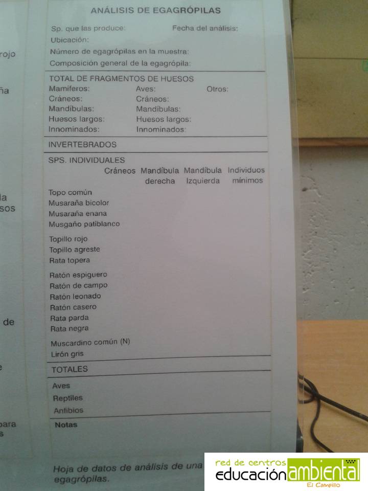 Una vez separados los restos óseos presentes en la egagrópila es conveniente realizar una separación del material extraído en grupos en función de sus similitudes (cráneos, fémures, costillas, vértebras, exoesqueleto de insectos…). A continuación, gracias a guías de identificación, puede llegarse a identificar la especie a la que pertenecen esos huesos.