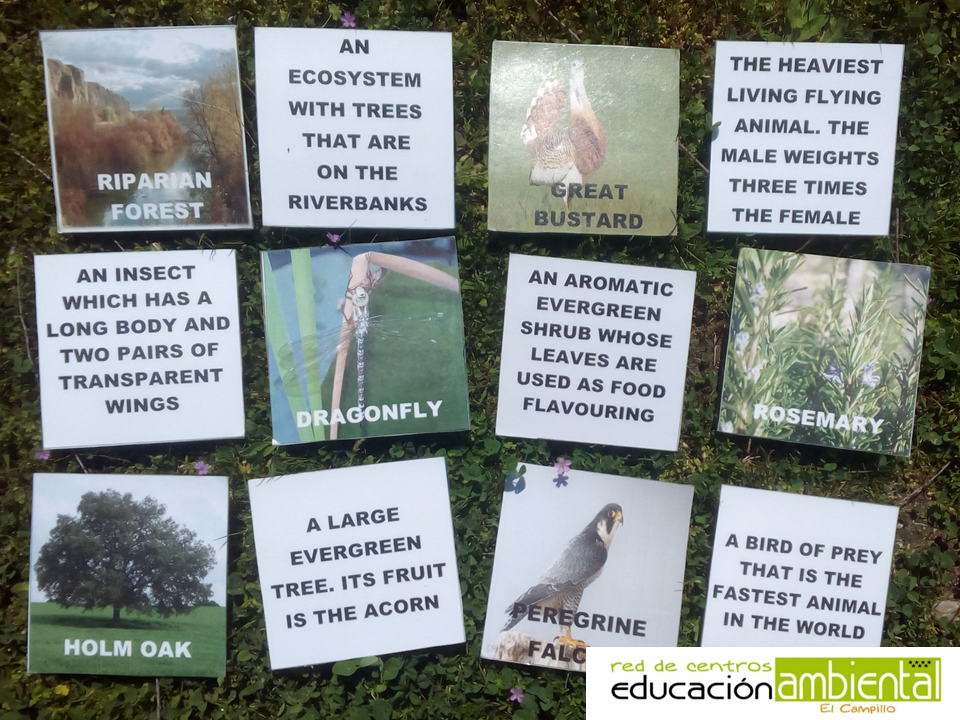 Por su parte, los alumnos de 3º a 6º de Primaria realizan la senda más completa, visitando el puente de Arganda. A lo largo de la senda se realizan varias paradas interpretativas para hablar de los ecosistemas y de los seres vivos que viven en cada uno de ellos y también se realiza la actividad «The hieroglyphic», a través de la cual los alumnos descubren el origen de la laguna. Una vez llegamos al centro, en pequeños grupos, jugamos al juego «Southeast Regional Park Memory Game», un juego de memoria formado por dos tipos de tarjetas: unas con fotos y otras con descripciones. Los alumnos tendrán que ir levantando las tarjetas de dos en dos para encontrar las parejas. Una vez localizadas las parejas, los alumnos que tengan las tarjetas de los ecosistemas se distribuyen a largo del aula y el resto de alumnos, con tarjetas de plantas o animales, han de localizar el ecosistema donde vive el ser vivo cuya fotografía portan.