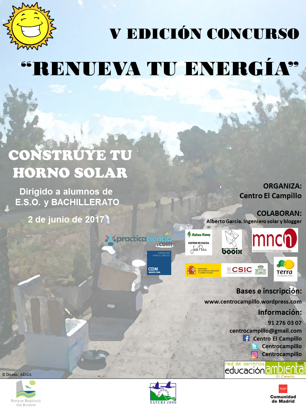 El pasado viernes 2 de junio celebramos en el Centro El Campillo la quinta edición del concurso “Renueva tu energía” cuyo principal objetivo es promover el uso de energías renovables entre el alumnado y concienciar sobre la importancia de hacer un consumo energético responsable, haciendo hincapié en los beneficios para un desarrollo sostenible. Este año participaron 270 alumn@s de secundaria de los centros educativos Colegio Malvar (Arganda del Rey), IES Duque de Rivas (Rivas Vacimadrid) e IES Menéndez Pelayo (Getafe) que presentaron a concurso 11 hornos solares diseñados y fabricados por el propio alumnado siguiendo las bases del concurso.