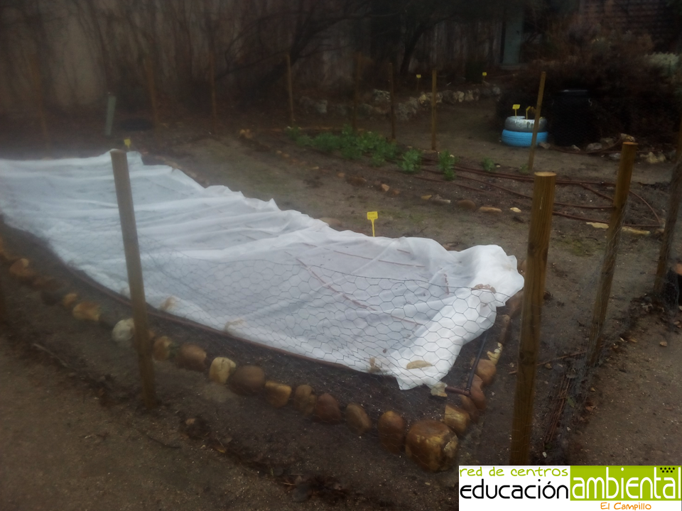 Nuestra huerta un día de lluvia en invierno: habas, remolachas y manta térmica.