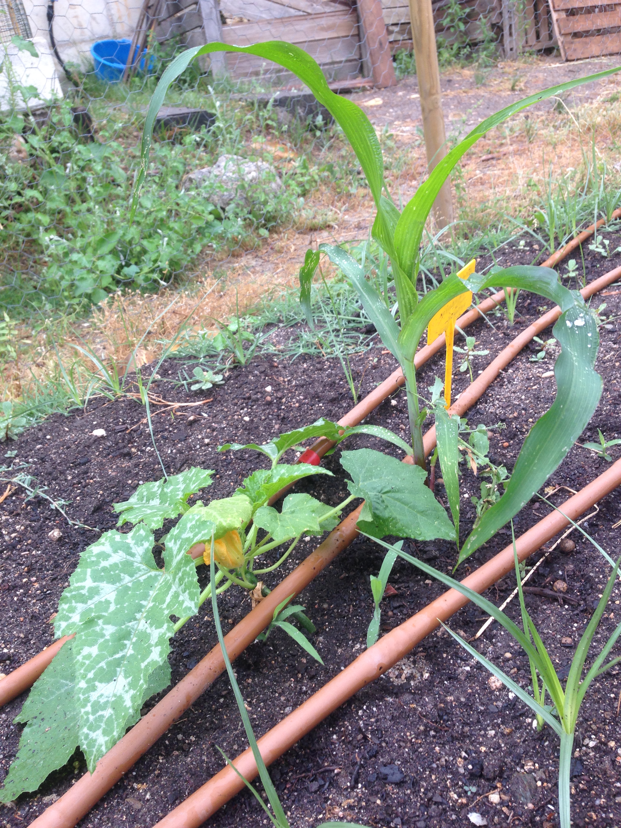 Las protagonistas de la huerta de verano pertenecen a la familia de las cucurbitáceas que abarca las calabazas, los calabacines, los pepinos, los melones y las sandías. Suelen ser rastreras o trepadoras, y en función de ésto se ha de planificar el espacio, las guías (tutores, redes) y las asociaciones a emplear para su cultivo. Una asociación muy característica del verano es la conocida asociación precolombina, que consta de una hortaliza erguida capaz de funcionar como tutor (como es el caso del maíz), una trepadora (normalmente una leguminosa como el guisante) y una cucurbitácea rastrera (como la calabaza o la sandía). Esta relación simbiótica se basa en un aprovechamiento completo del espacio, que no sólo nos ahorra preciados metros cuadrados en nuestra huerta sino que ayuda a prevenir el crecimiento de hierbas adventicias alrededor de nuestras hortalizas.