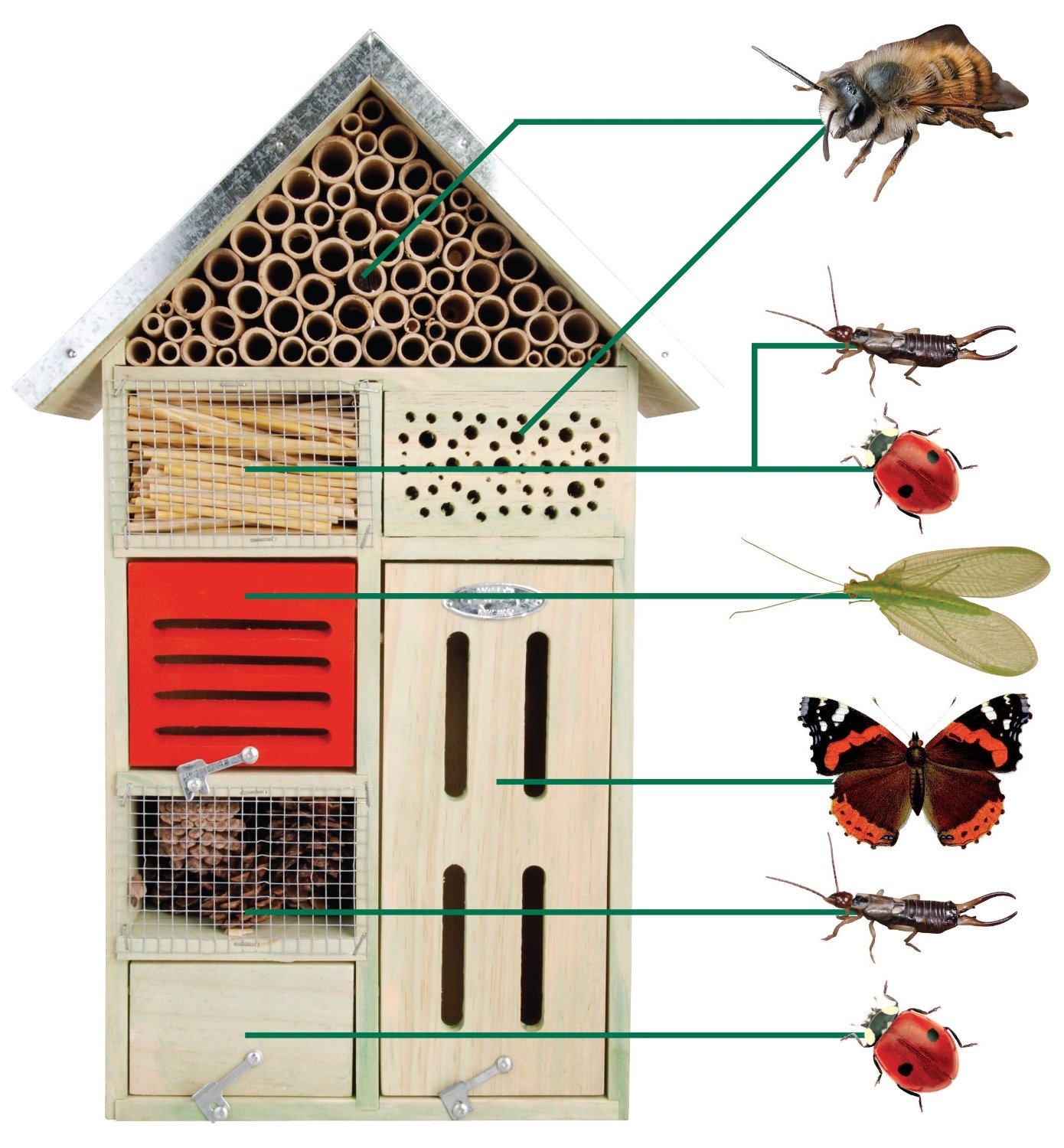 Hotel de insectos con compartimentos específicos para diferentes especies de fauna auxiliar. Fuente: http://es.permaculturescience.org/paginas-espanolas/3-cuidar-la-tierra/animales/mariposas