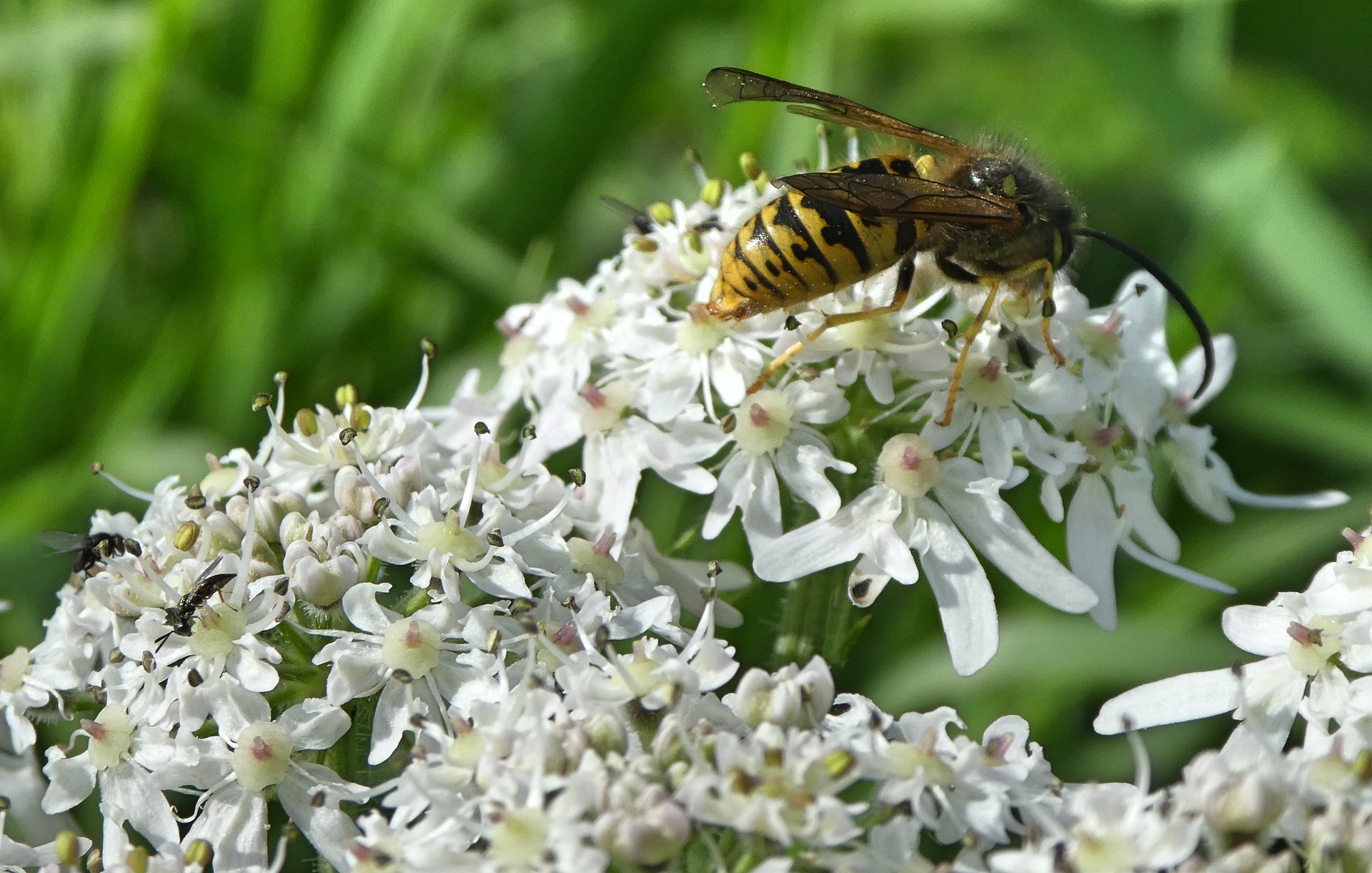 Al igual que las abejas, algunas avispas se alimentan de néctar siendo principalmente el macho de la especie el que va a visitar regularmente las flores para obtener este preciado manjar. De esta forma, poliniza las flores haciendo posible la producción de semillas y frutos.