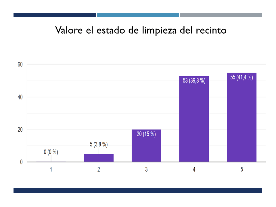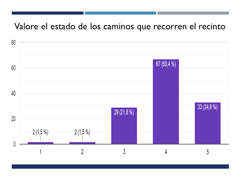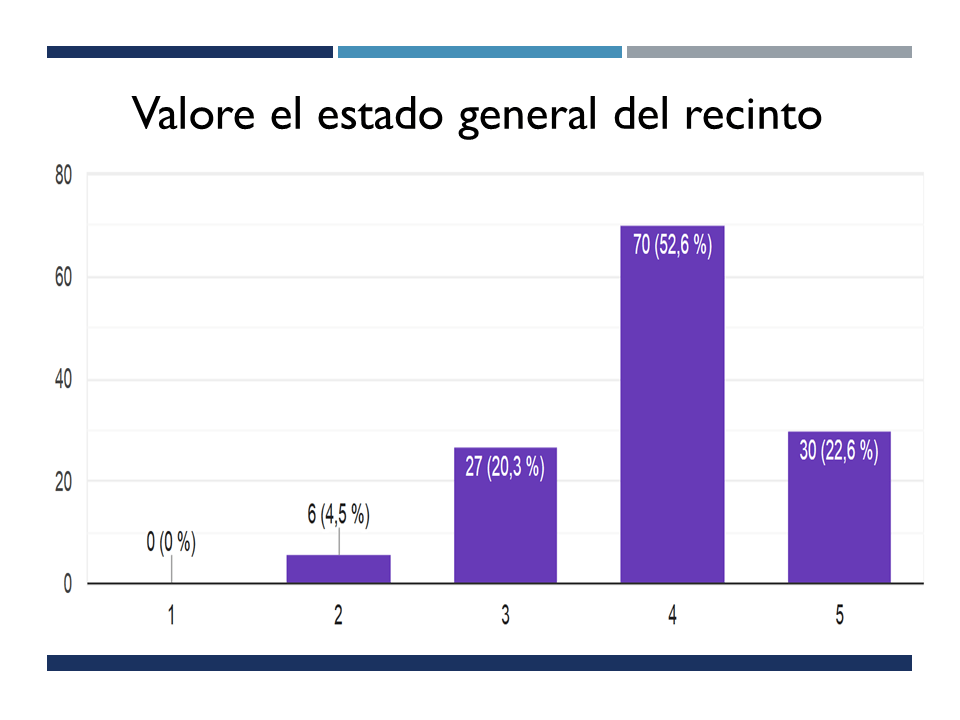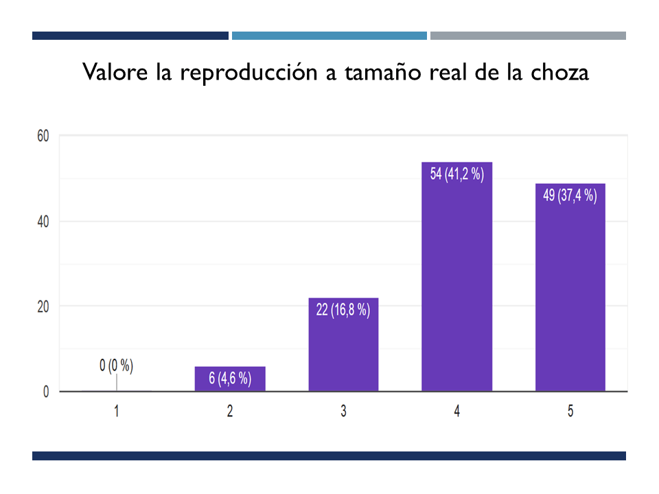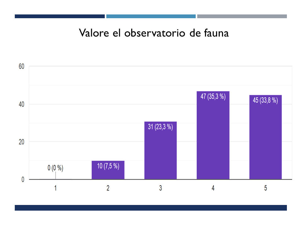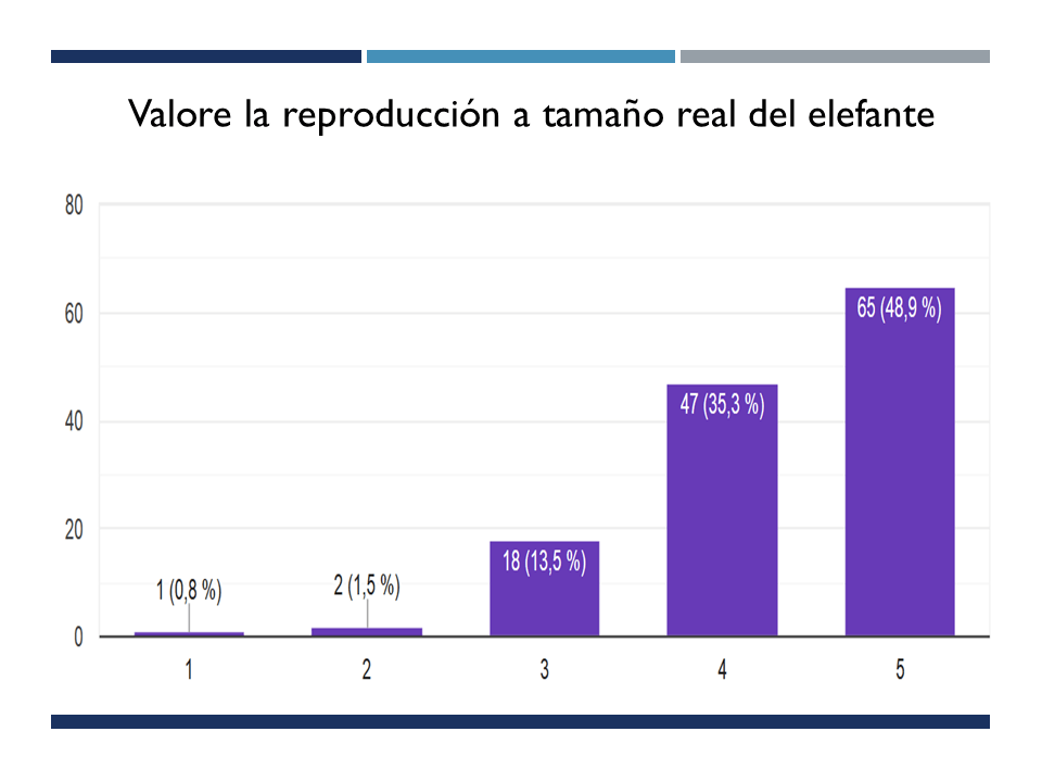 Las valoraciones recibidas fueron en su gran mayoría positivas, tanto las relacionadas con el estado del recinto (conservación general, limpieza, caminos) como las relativas a la valoración de los elementos presentes (observatorio, cabaña, elefante). De hecho, en una escala sobre 5, en todos los casos más de un 70% de las respuestas fueron 4 o 5.