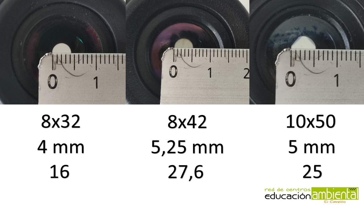 - Pupila de salida: es el cono de luz que sale por el ocular. Para calcular su valor debemos dividir la luminosidad entre los aumentos. Podemos observar ese cono mirando por los prismáticos con los ojos alejados de ellos. Cuanto mayor sea, más luz llega a nuestros ojos. Es el circulo de luz que vemos. El tamaño máximo de nuestra pupila es de 7mm.