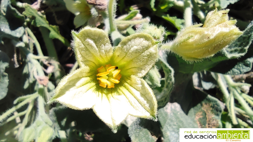 Las flores del también llamado pepinillo amargo o pepinillo loco aparecen desde la primavera hasta incluso principios del otoño, aunque con mayor intensidad en los meses de verano. Son flores de color amarillento, con forma de campana y unisexuales. Las flores machos crecen en racimos mientras que las flores hembras lo hacen de manera solitaria identificándose en la base de estas una zona ensanchada que es el ovario ínfero. La presencia o ausencia de flores de ambos sexos en la misma planta determina la subespecie a la que pertenece: subespecie elaterium si la planta es monoica (plantas con flores de ambos sexos) o subespecie dioicum si la planta es dioica (plantas solo con flores machos o solo con flores hembras). La subespecie que verás en el Parque Regional del Sureste es la que está presente en toda la Comunidad de Madrid: la subespecie dioicum.