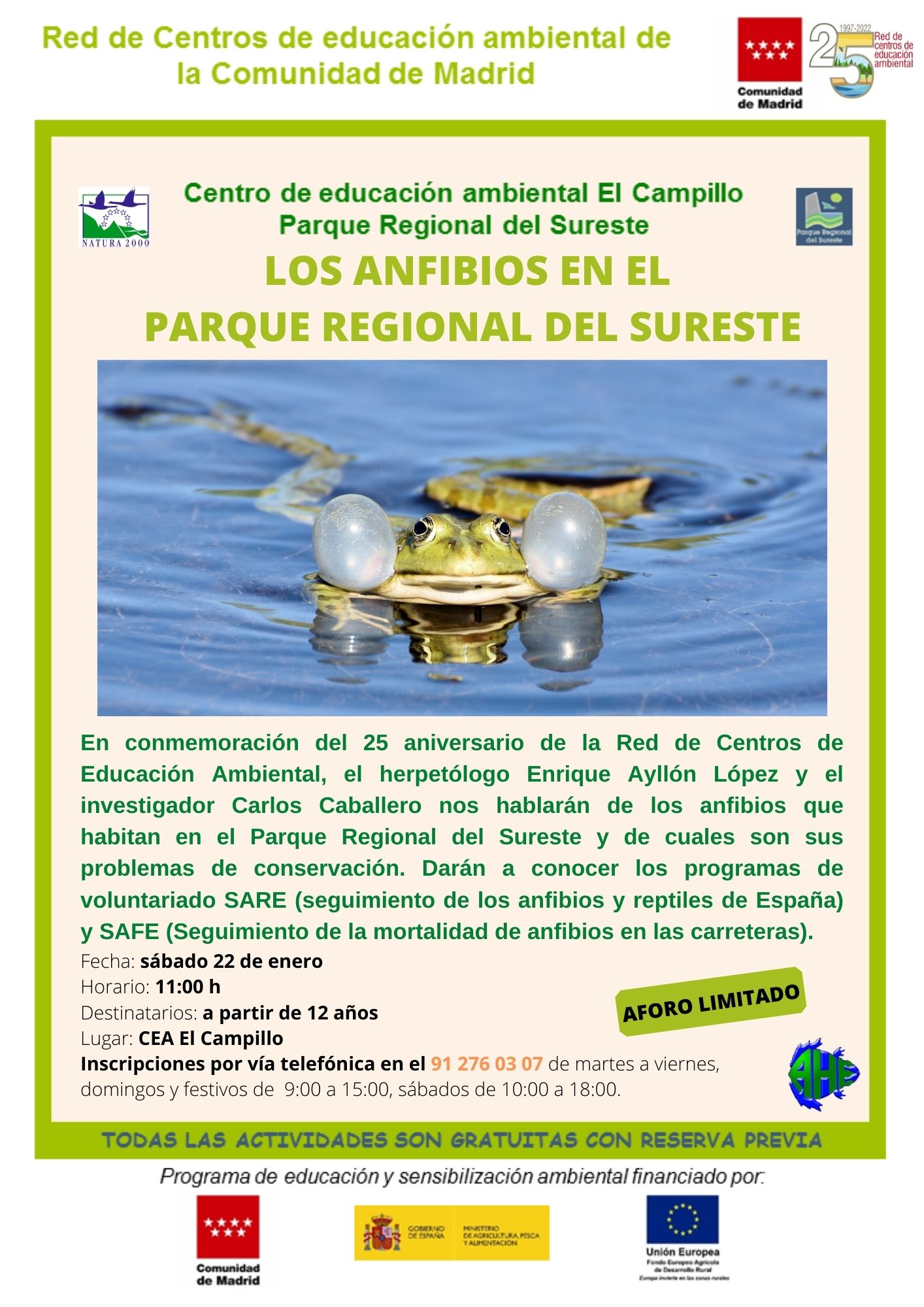 El pasado sábado 22 de enero tuvimos el privilegio de recibir a los herpetólogos Carlos Caballero, y Enrique Ayllón en el CEA El Campillo donde nos ofrecieron una charla en conmemoración del 25 aniversario de la Red de Centros de Educación Ambiental. Carlos es investigador predoctoral de la Universidad Autónoma de Madrid y está realizando el atlas de anfibios de la Comunidad de Madrid; Enrique, que ha trabajado en numerosas ocasiones con los anfibios y reptiles del Parque Regional del Sureste, es experto en anfibios y reptiles y gerente de la Asociación Herpetológica Española-AHE desde hace 15 años.