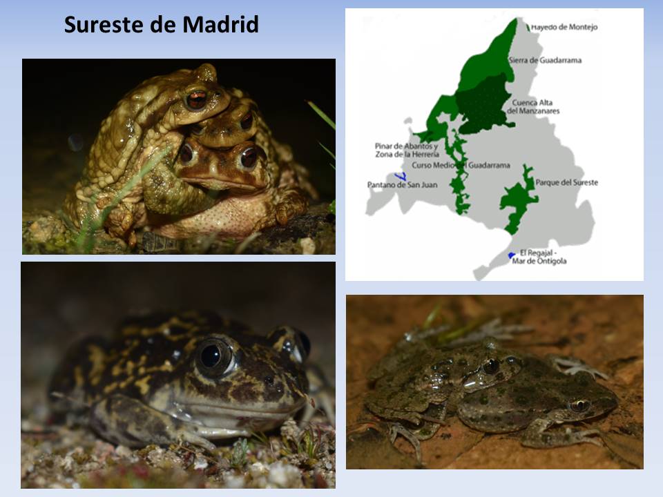 Seguidamente nos contó que la Península Ibérica es uno de los países con mayor biodiversidad de anfibios de Europa. De las 39 especies existentes en la península, el 50% se encuentran en la Comunidad de Madrid, de las cuales 8 están presentes en el Parque Regional del Sureste, convirtiendo así el Sureste Madrileño en un tesoro para el avistamiento de anfibios. Las especies presentes en el Parque Regional del Sureste son: gallipato (Pleurodeles waltl) (único anfibio urodelo presente en el parque), sapo común (Bufo spinosus), sapo corredor (Epidalea calamita), sapo de espuelas (Pelobates cultripes), sapillo pintojo ibérico (Discoglossus galganoi), rana común (Pelophylax perezi), sapillo moteado común (Pelodytes punctatus) y sapo partero común (Alytes obstetricans).