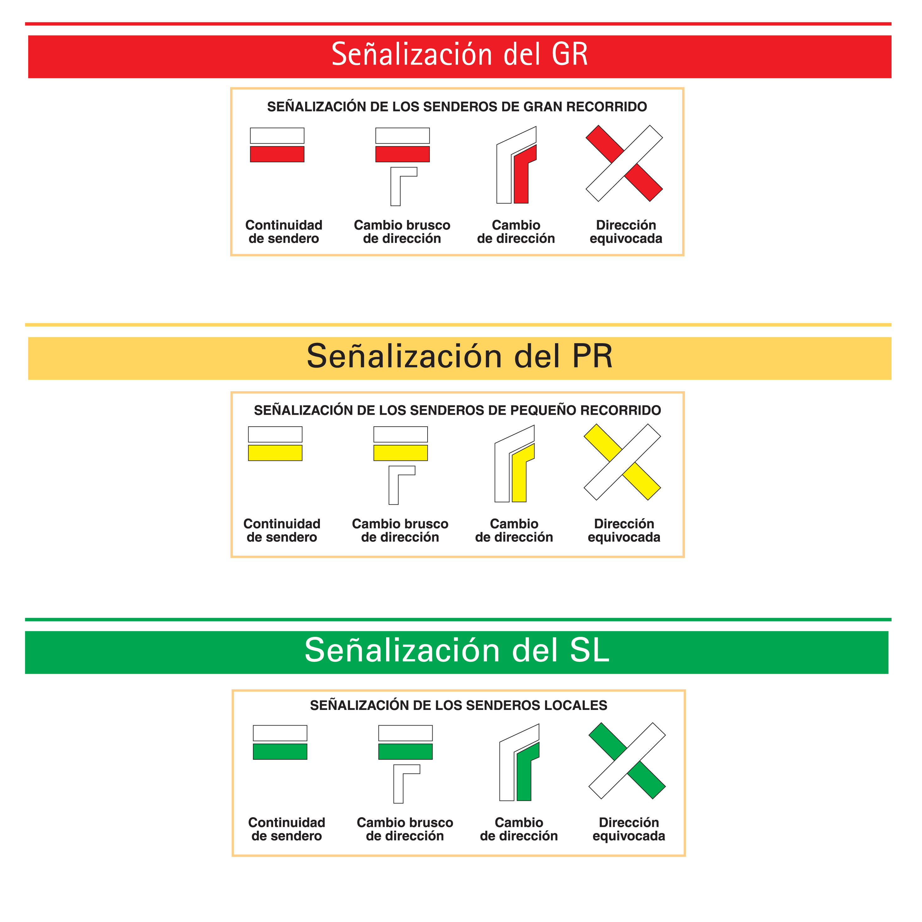 • Senderos de Gran Recorrido: se reconocen con los colores blanco y rojo y las siglas GR. Estos senderos son los más largos de los tres teniendo una longitud mínima de 50 kilómetros.