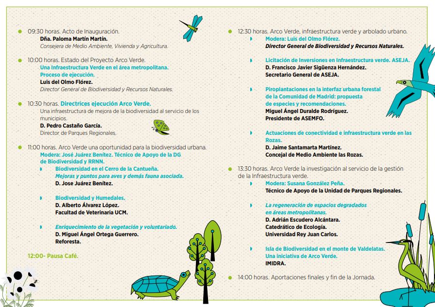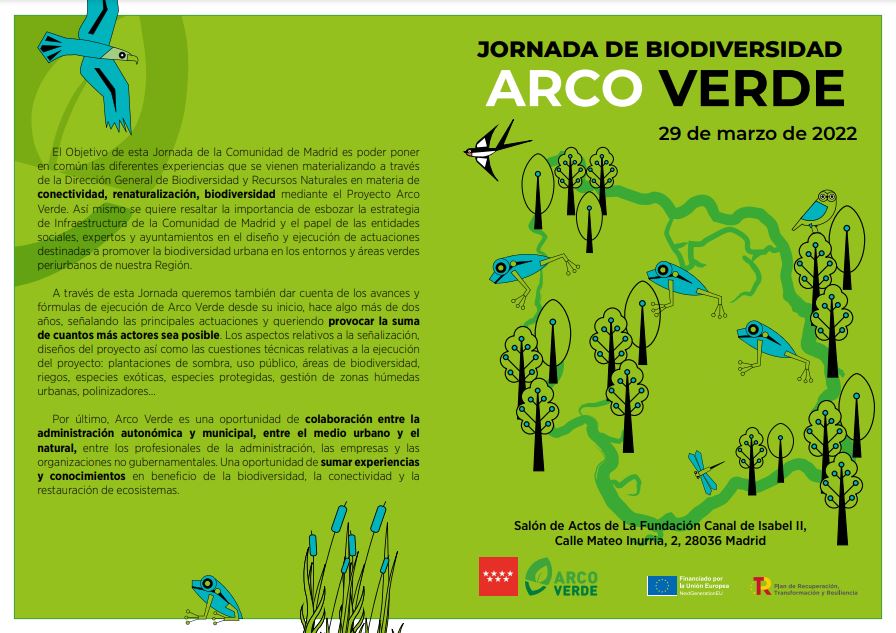 El pasado 29 de marzo asistimos a la Jornada de Biodiversidad ARCO VERDE, un proyecto de la Comunidad de Madrid que tuvo su inicio hace algo más de dos años. Con Arco Verde se conectarán 25 municipios con los 3 grandes Parques Regionales de la Comunidad: Cuenca Alta del Manzanares, Curso Medio del río Guadarrama y Parque Regional del Sureste, a través de la red de Vías Pecuarias y otros caminos y senderos, para crear un gran Corredor Verde que rodeará Madrid y los municipios de su Área Metropolitana. Además de los Parques Regionales, Arco Verde incluye espacios de la Red de Parques Periurbanos, Montes de Utilidad Pública, áreas forestales de alto valor ambiental y espacios naturales de nueva creación.