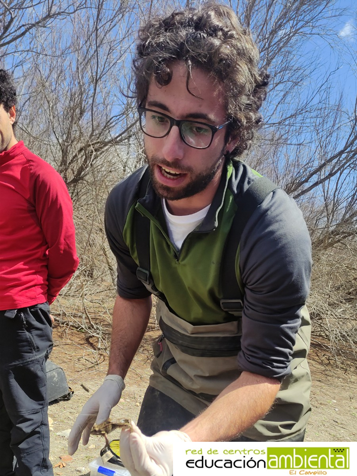 A continuación nos dirigimos a la zona de muestreo. Gracias a que Carlos tiene los permisos y formación pertinentes para realizar este tipo de trabajos y que llegó un poco antes que nosotros a la zona, a pesar del frío de esos días (que provoca que los anfibios se entierren y se muevan menos), pudimos observar en vivo y en directo a dos individuos de rana común: una hembra y un macho. Entre otras, las diferencias que nos ayudan a diferenciar un sexo del otro en los anfibios anuros es que el macho presenta unas almohadillas en las patas delanteras para favorecer el amplexo con la hembra y sacos vocales a ambos lados de la boca para poder producir las vocalizaciones.