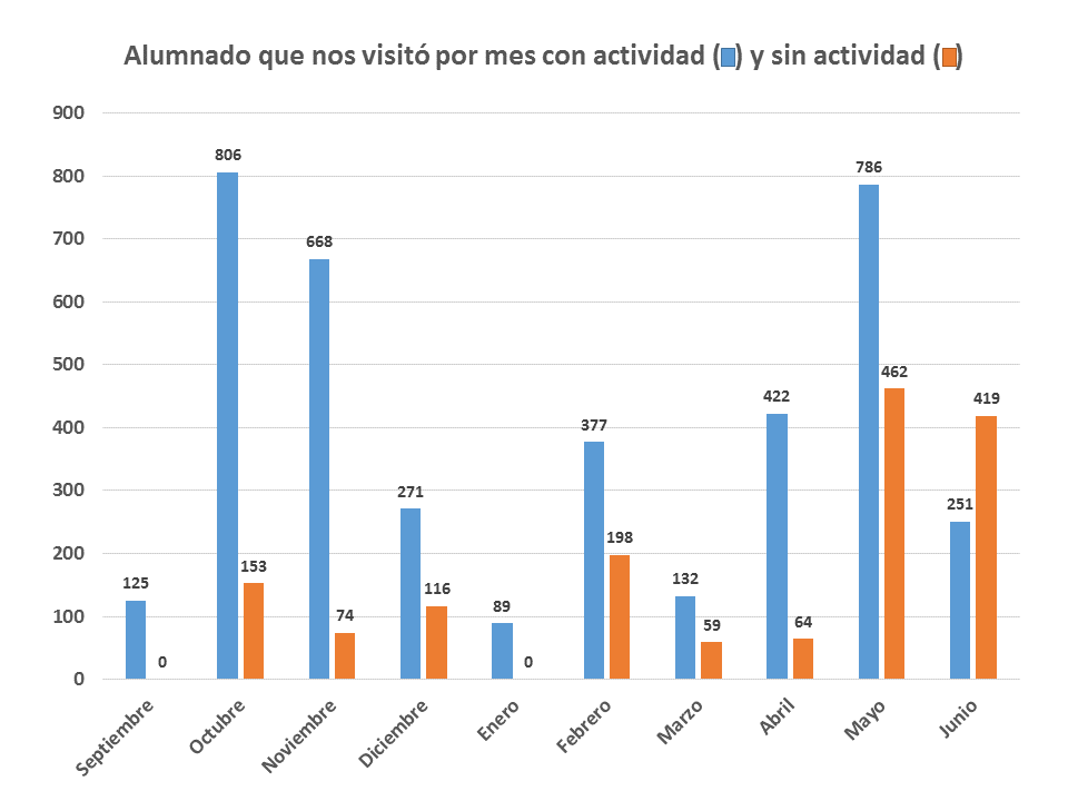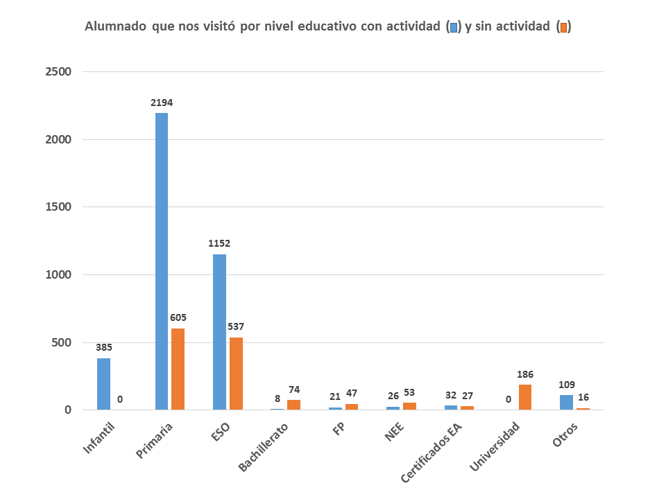 De todos los participantes en las actividades, 385 fueron de Educación Infantil, 2194 de Educación Primaria, 1152 de Secundaria, 8 de Bachillerato, 21 de Formación Profesional, 26 de Necesidades Educativas Especiales, 32 de Certificados de Profesionalidad de Educación Ambiental y 109 de otros cursos. Por su parte, de los que vinieron a través de una visita libre, fueron 605 de Educación Primaria, 537 de Secundaria, 74 de Bachillerato, 47 de Formación Profesional, 53 de Necesidades Educativas Especiales, 27 de Certificados de Profesionalidad de Educación Ambiental, 186 de universidad y 16 de otros cursos formativos. En ambos casos es Educación Primaria quien más nos visitó, seguido de Educación Secundaria.