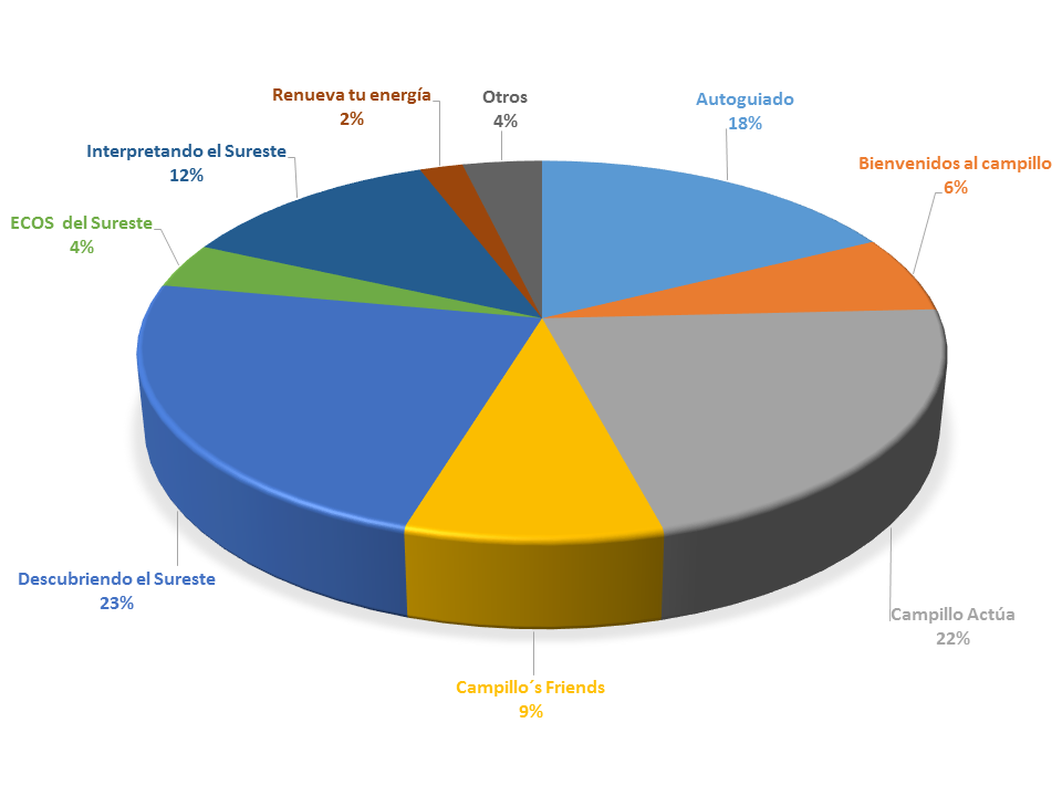 El eje educativo más demandado fue «Descubriendo el Sureste» que incluye las actividades de «Animales del Sureste», «Tesoros del Sureste» y «Secretos del Sureste», con 913 participantes (23%). Le sigue «El Campillo Actúa», compuesto por «Bosque cole», «El mundo de los residuos» y «Proyecto Campillo», con 850 participantes (22%), siendo la primera de las actividades la más demandada. Entra con fuerza una de las novedades de este curso, el Autoguiado «Explorando El Campillo» para Educación Primaria, con 692 participantes (18%) situándose en el tercer puesto de actividad más desarrollada entre las propuestas. El siguiente eje, con tendencia a la baja, es el de actividades en inglés que ha ido bajando paulatinamente del 21% en el curso 2015/2016 al 9% de este año.