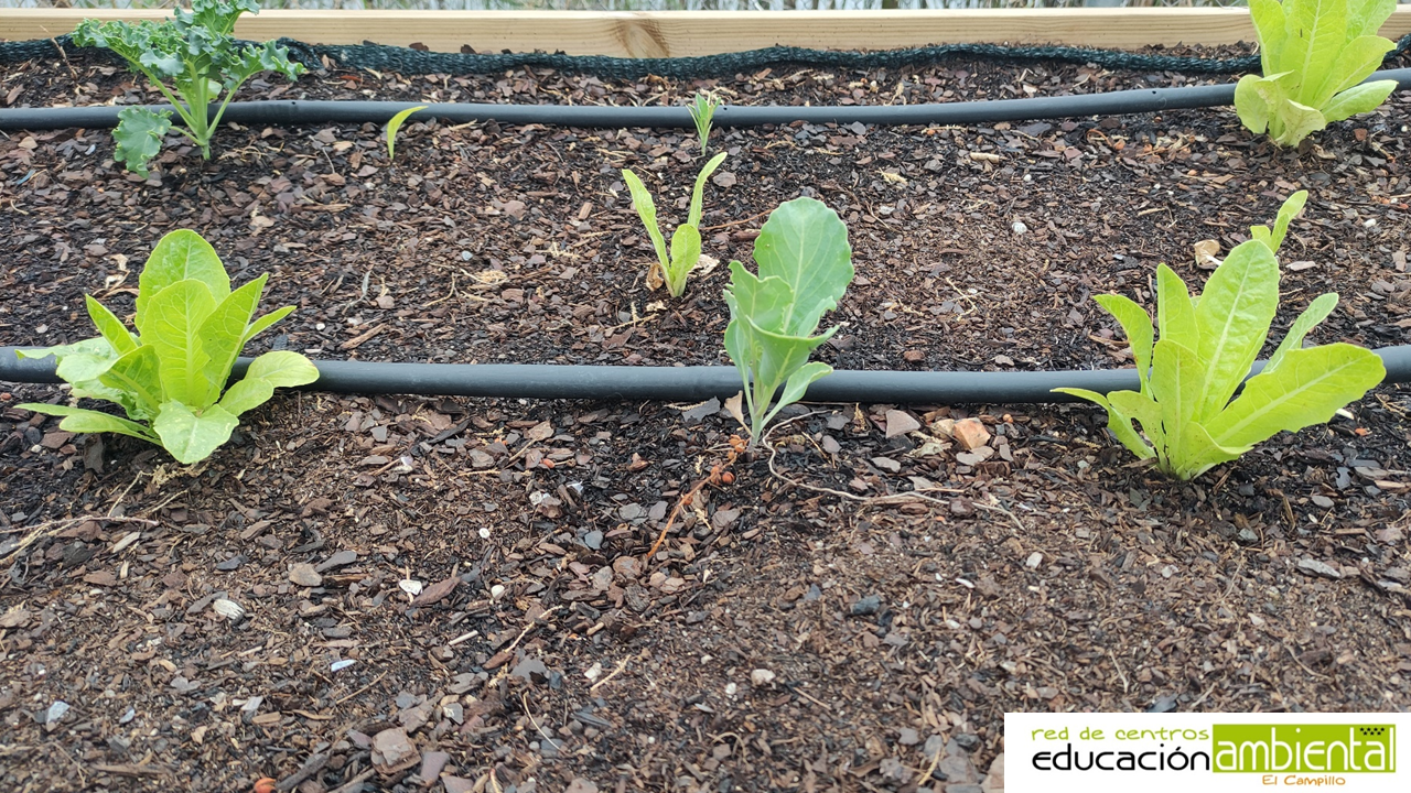 Mesa de cultivo de nuestra huerta plantada con coles y lechugas.