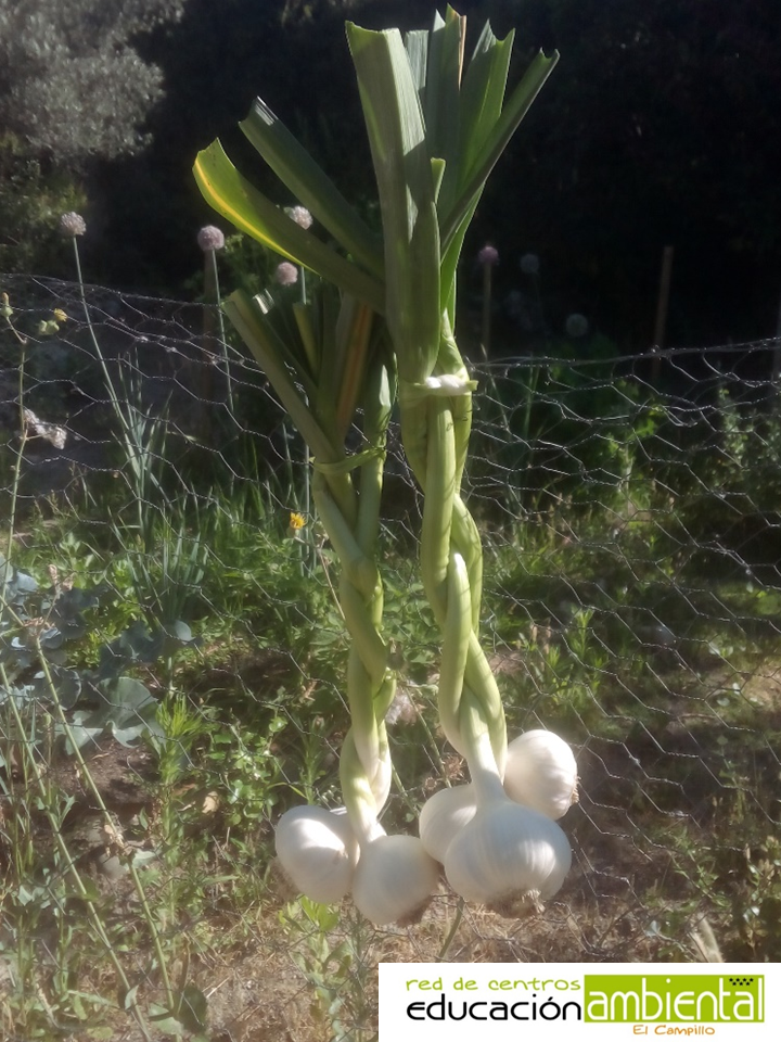 Ristra de ajos cosechados en nuestra huerta preparada para dejar secar.