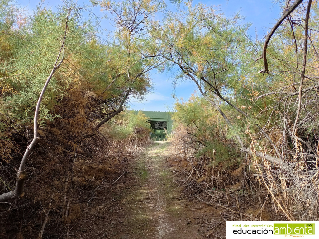 El camino continúa por el antiguo trazado de la vía ferroviaria dejando el cortado yesífero a un lado y el humedal a otro. Este camino, ya bastante despejado de árboles, nos lleva al observatorio, al que accederemos por un estrecho sendero flanqueado por taráis. En el observatorio, si hay suerte y dependiendo de la época del año, podemos ver aguilucho lagunero (Circus aeruginosus), focha común (Fulica atra), calamón común (Porphyrio porphyrio), zampullín común (Tachybaptus ruficollis) o el martín pescador (Alcedo atthis).