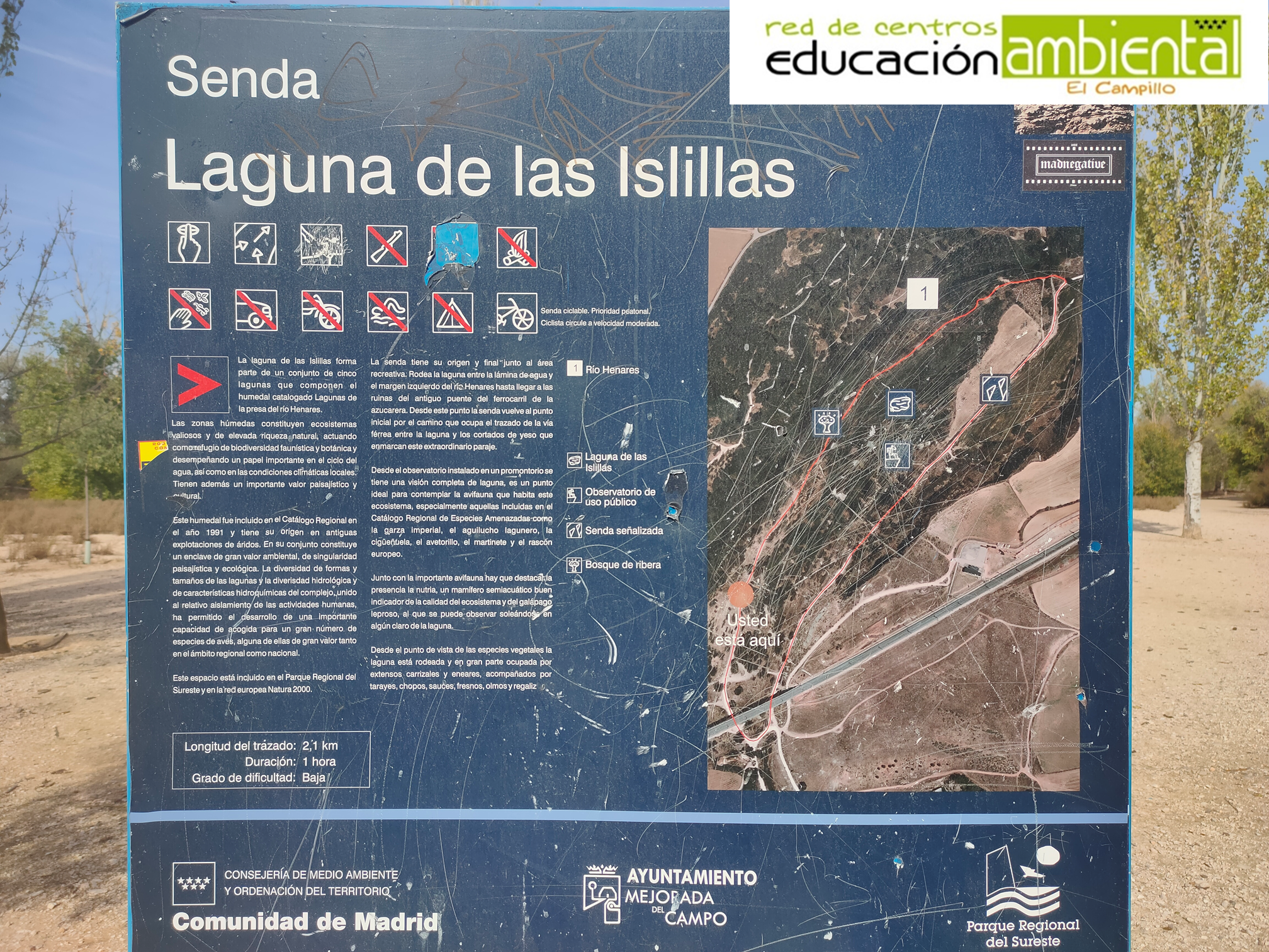 La senda comienza junto al cartel que se sitúa junto al área recreativa, aunque al ser circular puede comenzarse al revés. Se trata de una senda sencilla, circular y llana, de 2,1 km.