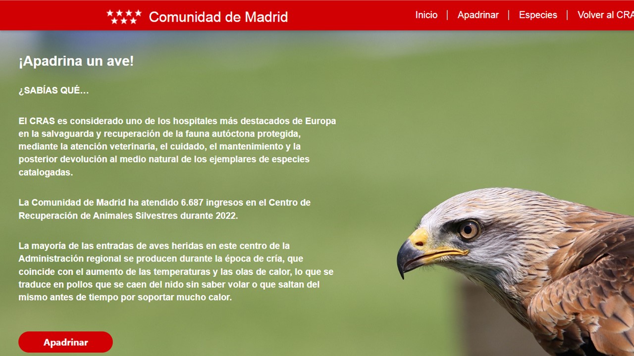El proceso de apadrinamiento se realiza a través de la web https://apadrinaunave.comunidad.madrid/. Una vez en la página, aparece un menú con las aves que han entrado en ese momento en el centro de recuperación. Puedes seleccionar el ave que quieras apadrinar, pinchando en alguna de las opciones disponibles. ¡Así de sencillo es completar el proceso de apadrinamiento! Además, llegará a tu correo de contacto, un diploma de apadrinamiento.