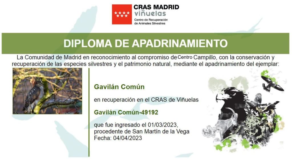 ¿Quieres participar en el apadrinamiento de un ave? El CEA El Campillo ha tenido la oportunidad de apadrinar un gavilán común (Accipiter nisus), gracias al proyecto «Apadrina un ave» del Centro de Recuperación de Animales Silvestres (CRAS) y de la Comunidad de Madrid. Este gavilán había ingresado el 1 de marzo de 2023 con un traumatismo provocado por una colisión, procedente de San Martín de la Vega, uno de los municipios del Parque Regional del Sureste.