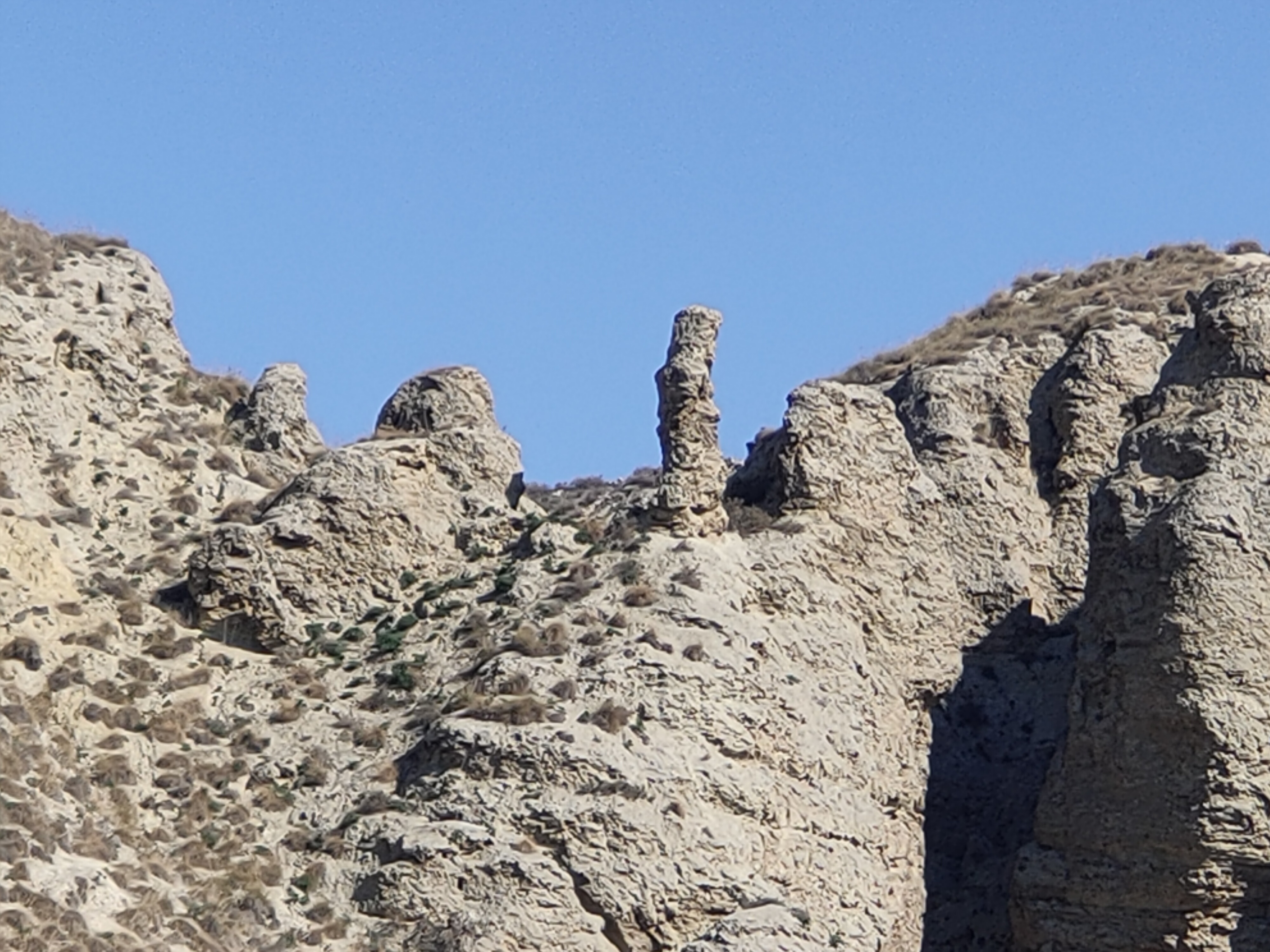 Avanzamos y una vez que abandonamos el camino estrecho podemos observar al fondo en los cortados una formación muy característica en forma de chimenea (de hecho, se denomina geológicamente como «Chimenea de hadas«) creada por la elevada erosionabilidad de los materiales que los componen como por ejemplo el yeso.