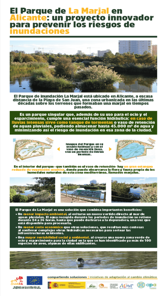 Entre las 15 iniciativas expuestas en nuestro mirador podrás descubrir proyectos para prevenir los riesgos de las inundaciones (como El Parque de La Marjal de Alicante y las mejoras del entorno natural de los ríos Júcar y Moscas a su paso por Cuenca), para adaptar la agricultura y la ganadería (Life AgriAdapt y el Grupo Operativo Setos) o restaurar espacios altamente impactados por el ser humano (el desmonte y restauración de Valcotos o el incremento de la biodiversidad en la Plataforma Central Iberum de Illescas).