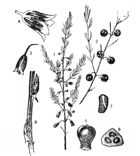 Fig. 2- 1. Espárrago; 2. Frutos madruos; 3-4 flor; 5-6. ovario y sección del mismo; 7. Semilla; 8. Turón. Fuente: Ministerio de Agricultura, 1958