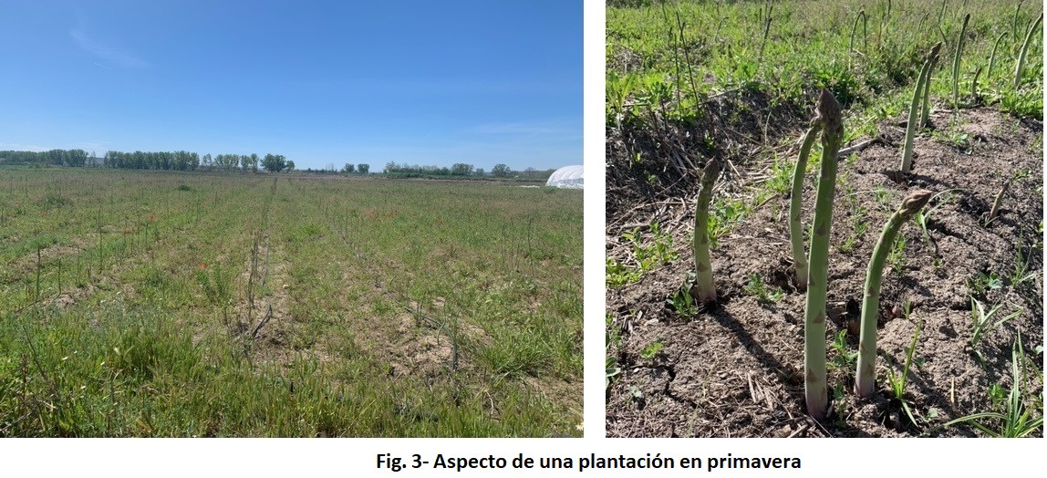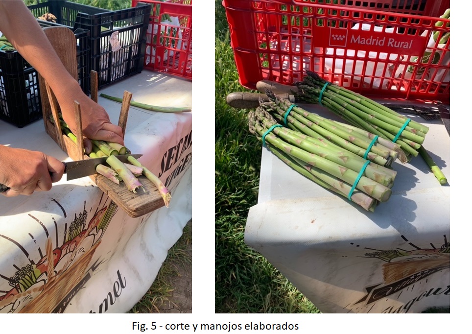 Se realiza con un cuchillo especial llamado “multidiente”, este se introduce paralelamente a la dirección del turión y se empuja gradualmente hasta separar de un tajo el espárrago. La recolecta comienza en los meses de marzo y abril, pudiendo durar 2 o 3 meses en plena producción.