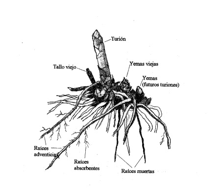 La esparraguera (Asparagus officinalis L.) pertenece a la familia de las Liliáceas, es perenne, con un sistema rizomático subterráneo en forma de plataforma con numerosas raíces sencillas, cilíndricas y rastreras conocida vulgarmente con el nombre de «garra». En la base de esta plataforma rizomatosa aparecen continuamente yemas de las que se originan los tallos del espárrago o «turiones» que constituyen la parte comestible de la planta. En un principio, y mientras se desarrollan bajo tierra, estos turiones son blancos y poseen unas hojas escuamiformes muy pegadas a los propios tallos. Cuando se dejan crecer libremente al exterior, adquieren un color verde pudiendo llegar a alcanzar una altura de 1,5 m y desarrollar ramas laterales provistas de hojas muy rudimentarias y escuamiformes (es decir, con forma de escama).