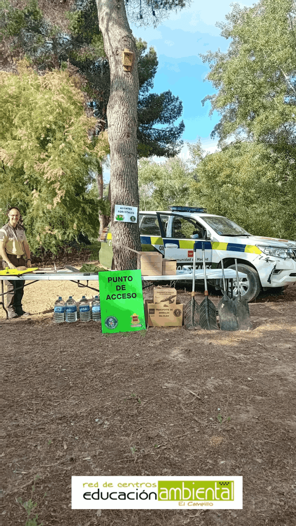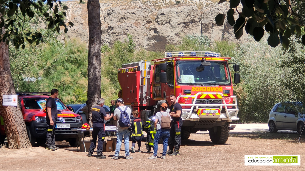 Además volvimos a tener la suerte de contar con algunos cuerpos de seguridad encargados de proteger la naturaleza: los Agentes Forestales nos hicieron toda una demostración práctica de cuáles son las técnicas utilizadas para la extinción de incendios, los bomberos de Arganda del Rey trajeron el camión que utilizan para apagar incendios forestales y nos refrescaron con agua al final de la jornada y el Servicio de Gestión y Conservación del Parque Regional del Sureste  nos mostró los trabajos que realizan y el equipo que utilizan. Este año también contamos con la presencia de Protección Civil Rivas que nos acompañó y disfrutó de la jornada mostrando la labor que realizan y el interior de la ambulancia. Así mismo vino Cruz Roja para trasmitirnos la labor medio ambiental que realizan.