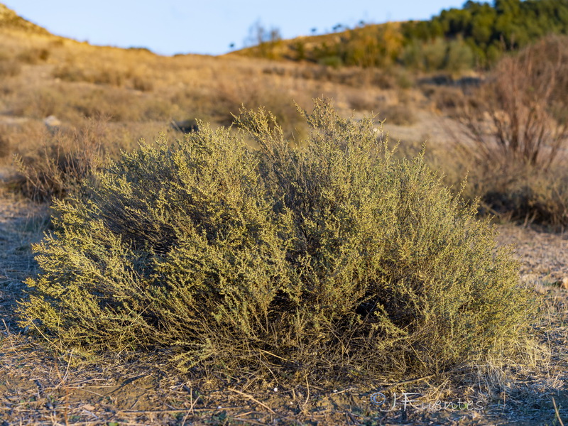 Planta de la familia de las Compuestas (Asteraceae) Es un caméfito que puede superar los 50 cm y vivir más de 20 años. Es perennifolia, de color grisáceo o verde-blanquecino, de ahí su epíteto (herba-alba)