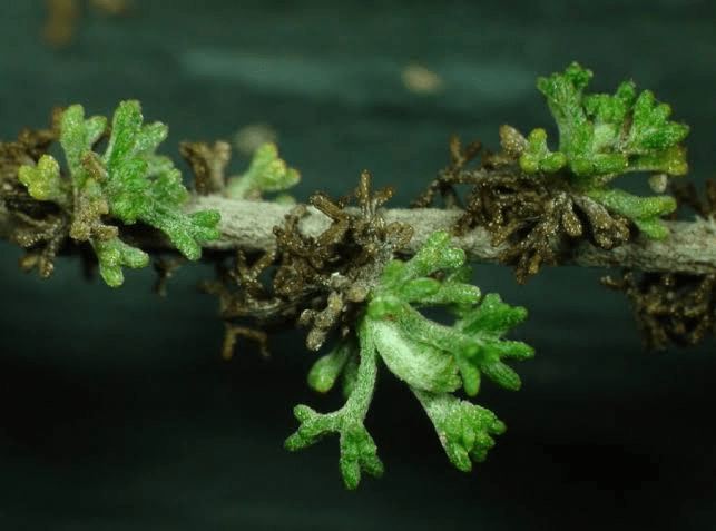 Sus hojas son de pequeño tamaño y muy cortas (2-8 mm), con fuerte olor. Se disponen alternas en el tallo, de color verde-obscuro cuando son jóvenes, tornándose glaucas o grisáceas al madurar. Sus lóbulos están mas o menos revueltos según la época del año. Carece de espinas en el tallo y en las hojas.