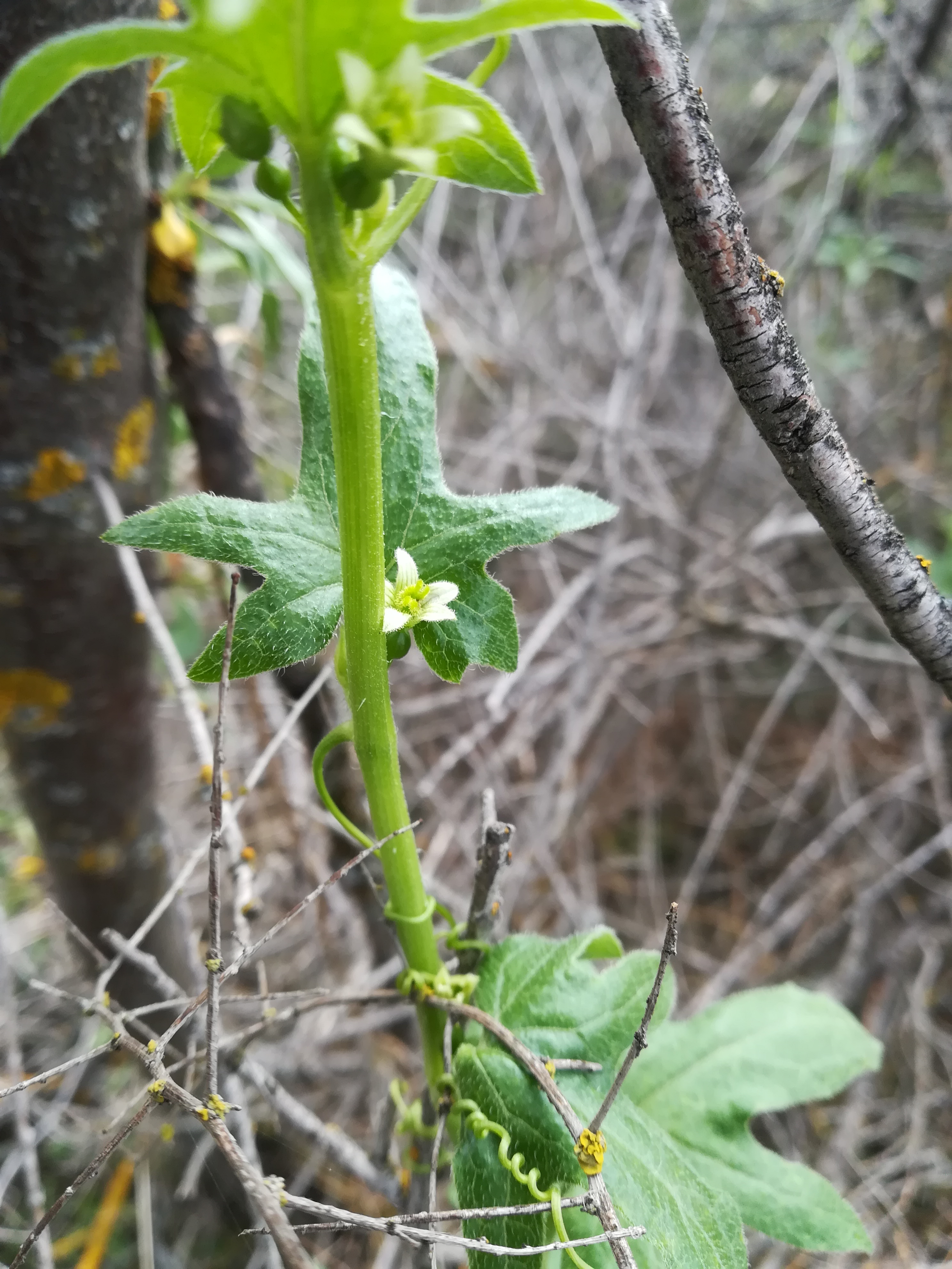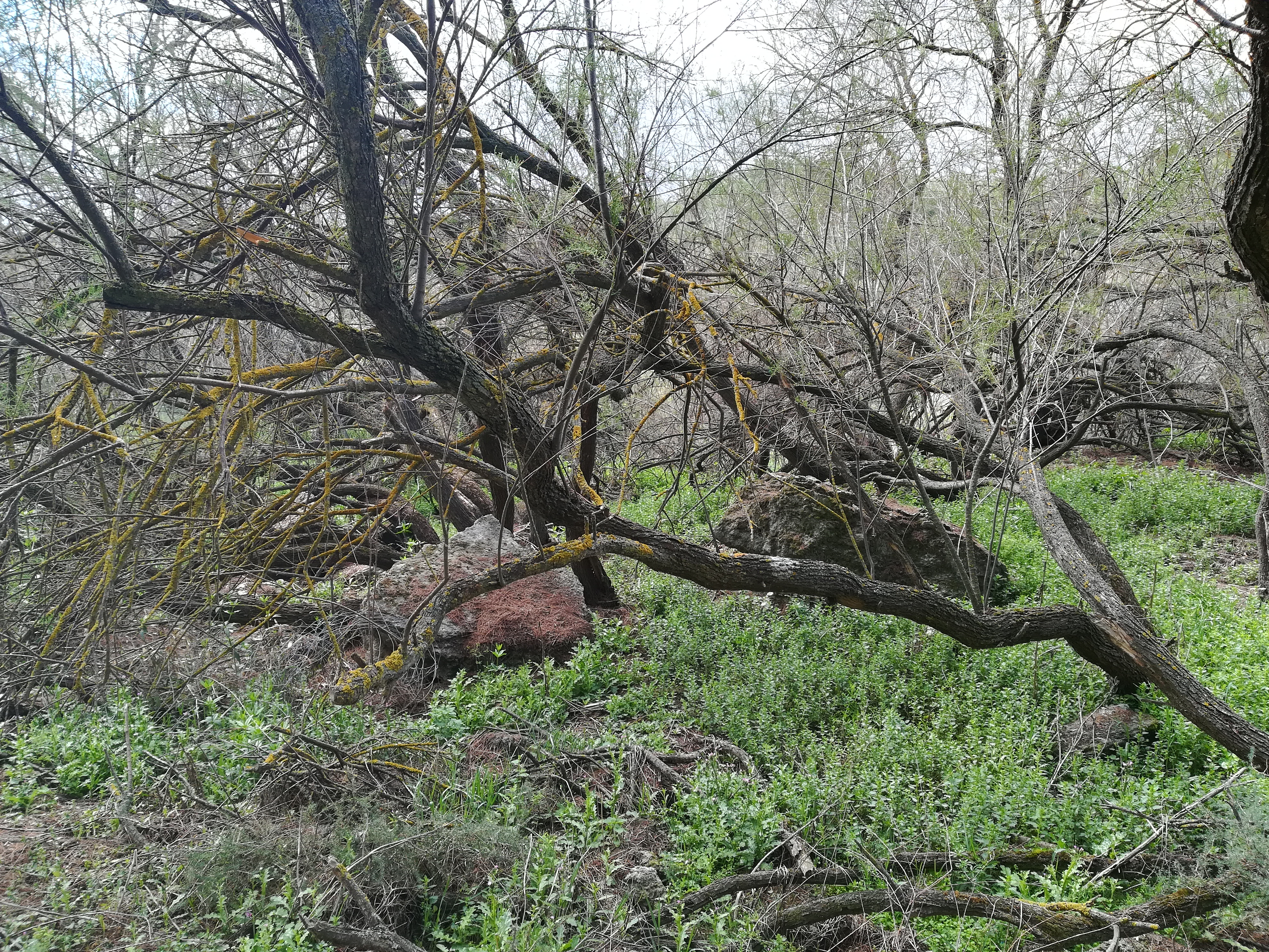 Por el camino elegido, el de la izquierda, llegaremos a un Tarayal, es decir, un bosque de tarays , arbusto que puede llegar a tener porte arbóreo, que prefiere suelos húmedos y salinos. Es un arbustivo astringente, con ramas de aspecto retorcido y hojas caducas simples y escuamiformes. Tiene una flor blanca o rosa, dispuesta en espigas, que destaca mucho en primavera. La nueza o Bryonia dioica, es una planta trepadora que solemos encontrar junto a este tarayal.