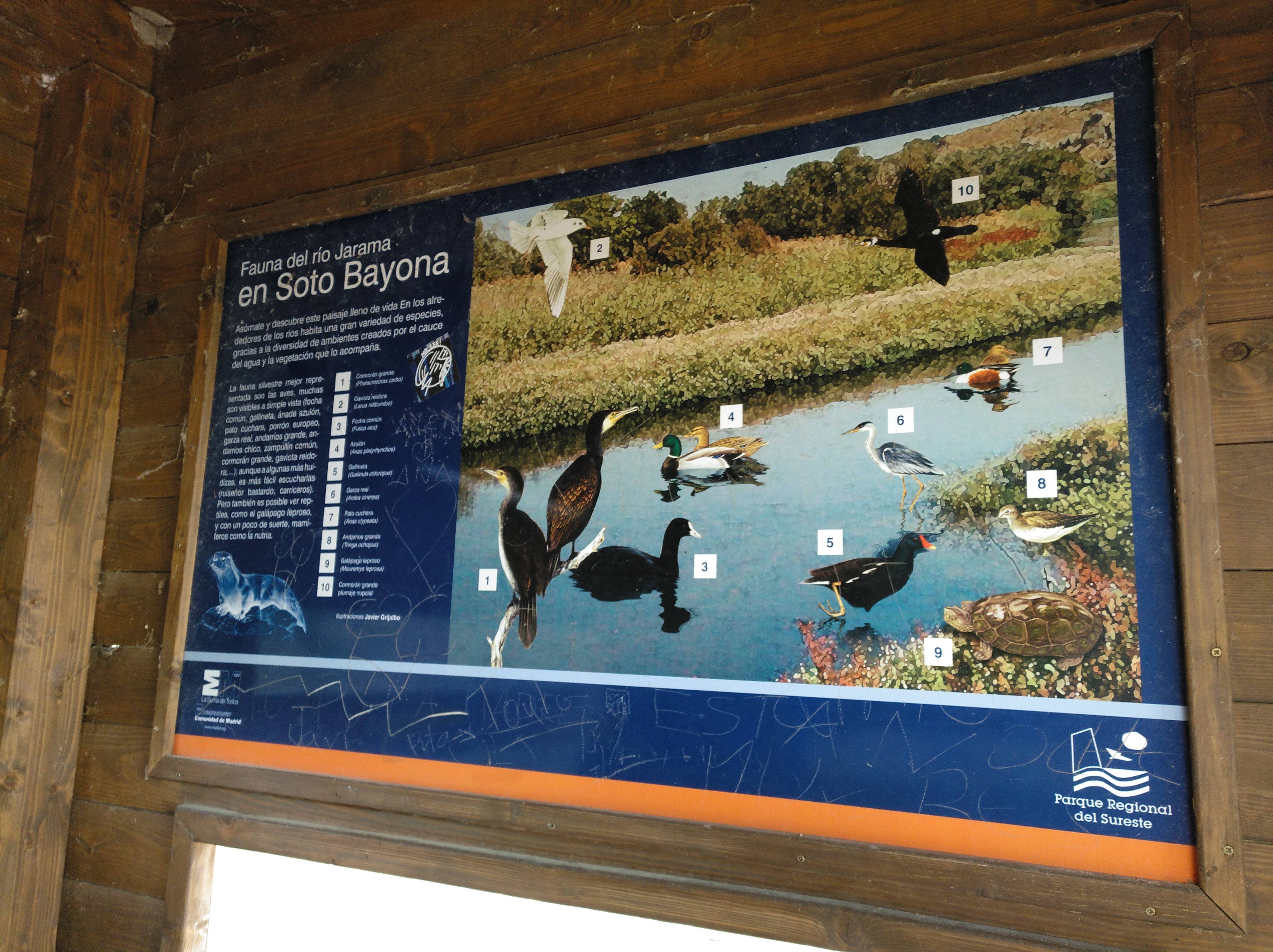 Si seguimos por el camino, nos encontraremos un observatorio de fauna orientado a un meandro del río Jarama donde se encuentran dos paneles informativos (uno exterior y otro interior al observatorio) que nos informaran de algunas de las especies animales que forman parte del ecosistema de ribera .
