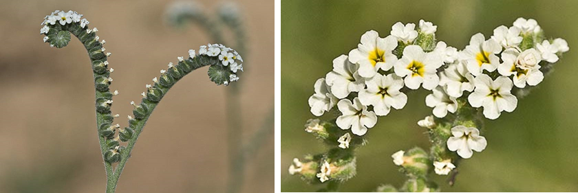 La inflorescencia se compone por unas diminutas flores, blancas o violáceas, agrupadas densamente en las cimas escorpiodeas. Florece desde junio hasta octubre.
