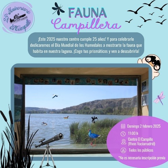 En el CEA El Campillo, hemos organizamosun fin de semana completo. El sábado 1 de febrero, realizaremos un avistamiento en las Lagunas del Porcal, y el día 2, nos reuniremos en nuestro mirador del centro para disfrutar de la fauna campillera, entre las 11:00 h y las 13:00 h. Para la actividad del domingo 2 de febrero no es necesario reserva previa.