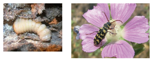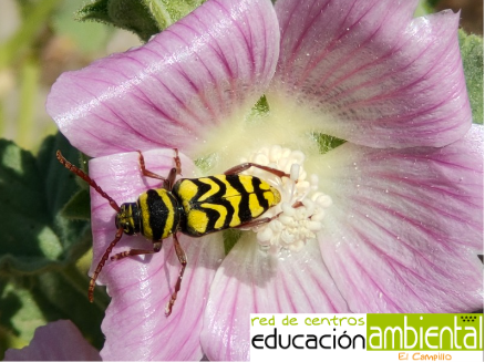 A la derecha: Neoplagionotus marcae en Lavatera triloba. Fuente: Coleópteros de la Comunidad de Madrid (Ayto. de Aranjuez).