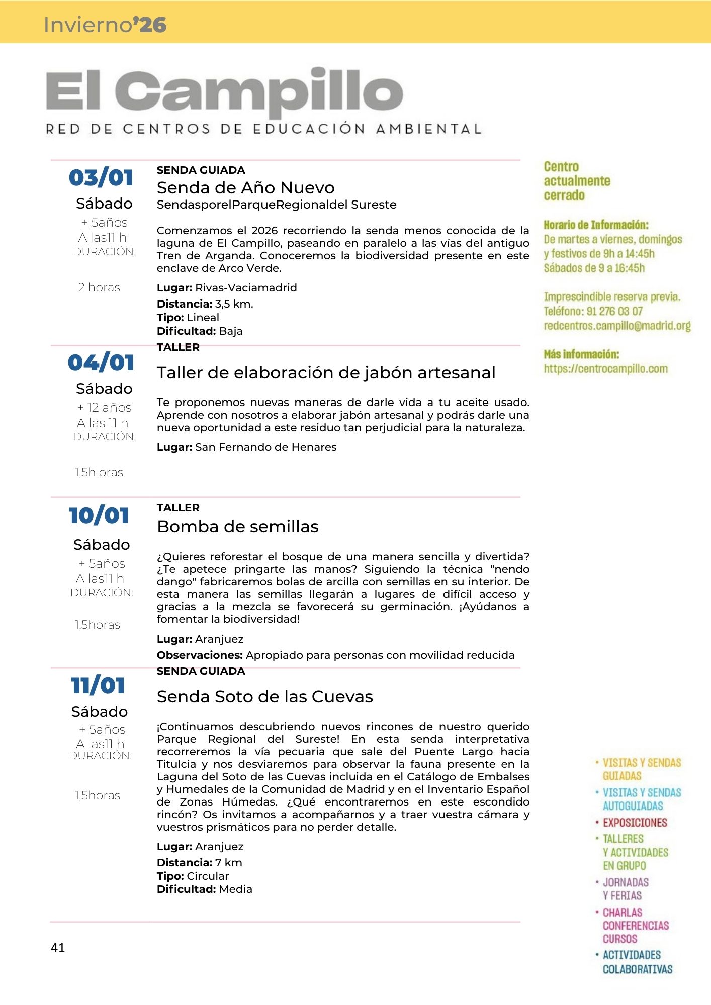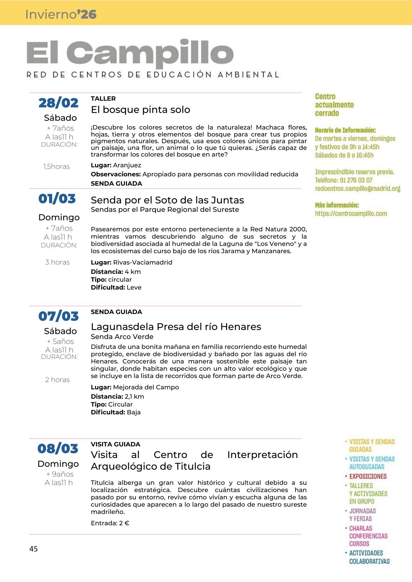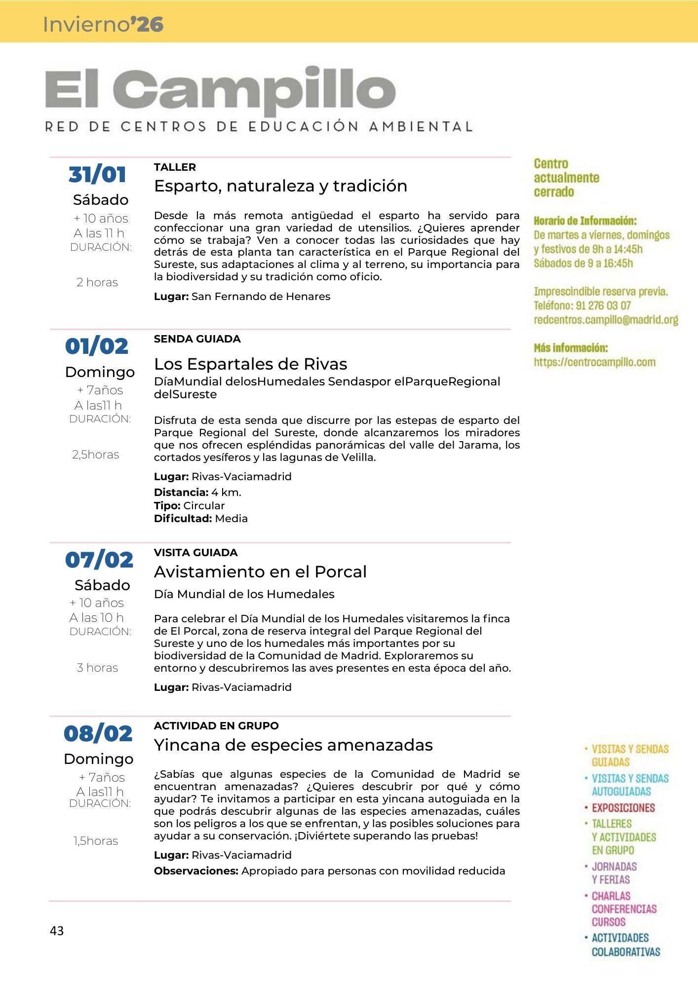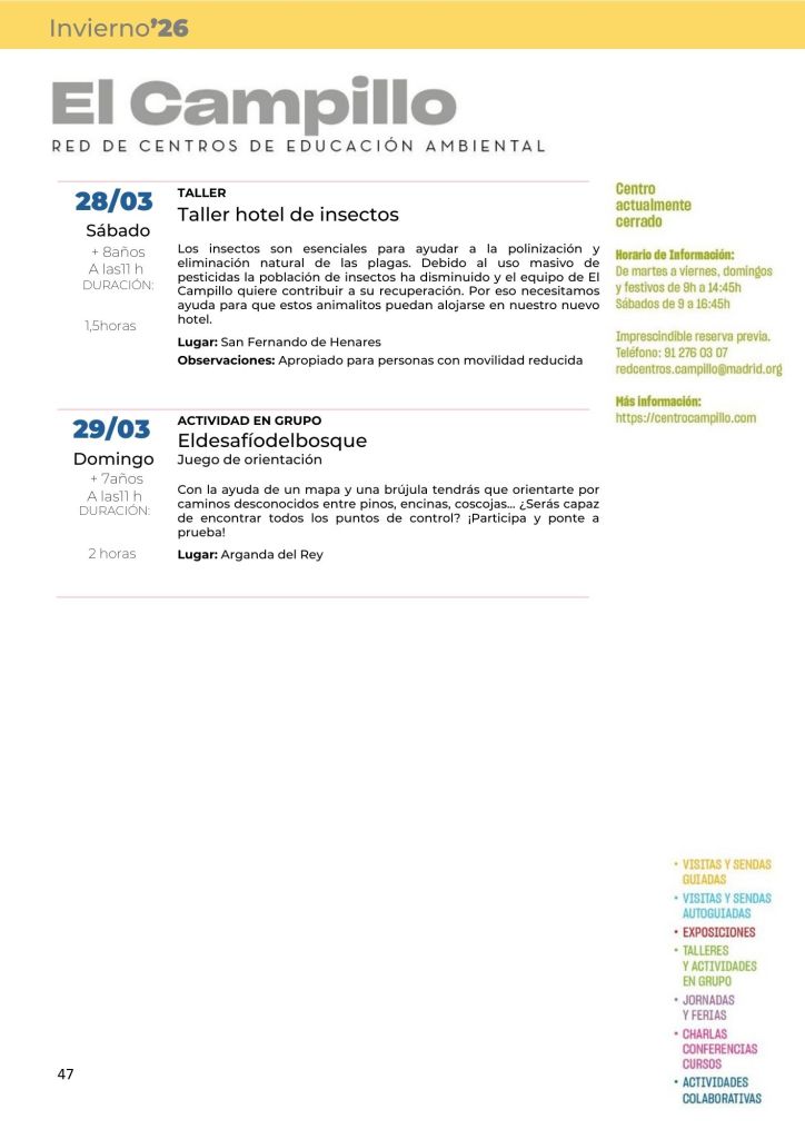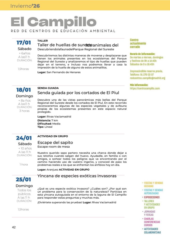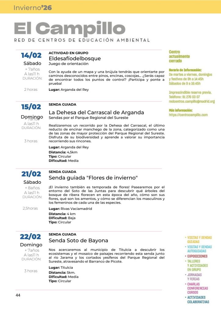 Programa de Actividades Fines de Semana Invierno 2026 Posted by centrocampillo 0 CONSULTA LA PROGRAMACIÓN COMPLETA DE LA RED DE CENTROS DE EDUCACIÓN AM BIENTAL DE LA COMUNIDAD DE MADRID EN EL SIGUIENTE ENLACE: Haz clic para acceder a programacion_red_de_centros_de_educacion_ambiental_invierno_2026.pdf Me gusta Cargando... Relacionado