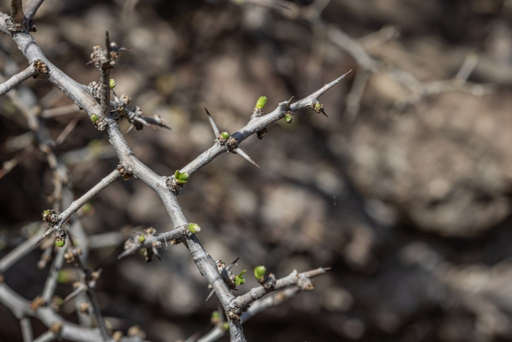 Se trata de un arbusto muy ramificado, de tallos blanquecinos, pubescente, es decir, cubierto de pelillos finos y cortos, que puede alcanzar los 5 metros de altura. Las ramas son largas, colgantes y flexibles, con fuertes espinas terminales y laterales.