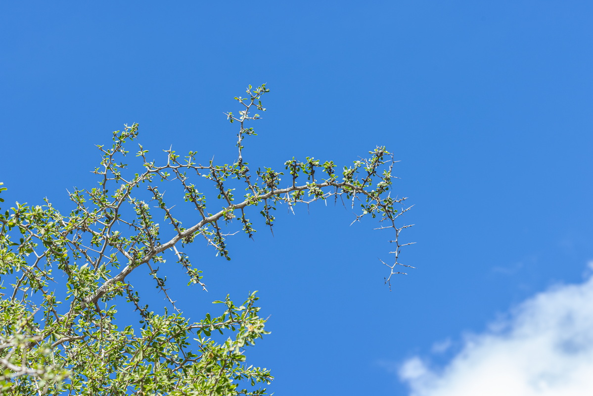 Se trata de un arbusto muy ramificado, de tallos blanquecinos, pubescente, es decir, cubierto de pelillos finos y cortos, que puede alcanzar los 5 metros de altura. Las ramas son largas, colgantes y flexibles, con fuertes espinas terminales y laterales.