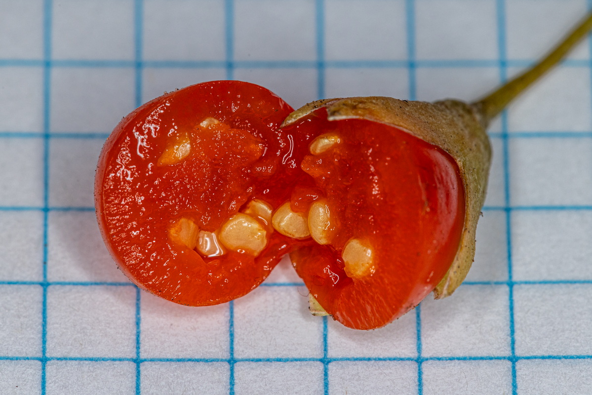 Fruto tipo baya, subgloboso, es decir, casi esférico o aplanado, de 5 a 6 mm de diámetro, de color rojizo virando al negro en la desecación. Las semillas de tamaño entre 3 x 2,5 mm, subesféricas o reniformes (con forma de riñón) de color pardo y con un peso de 1,8 mg.