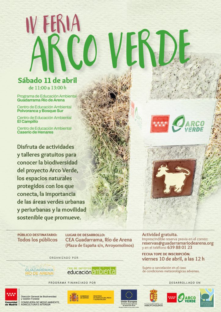 El pasado 11 de abril, se celebró la IV Feria de Arco Verde, en esta ocasión organizada por el CEA Guadarrama Río de Arena, en Arroyomolinos. Arco Verde es un proyecto de la Comunidad de Madrid que acerca la naturaleza a la ciudadanía conectando 25 municipios con los 3 Parques Regionales (Cuenca Alta del Manzanares, curso medio del río Guadarrama y Parque Regional del Sureste), centros de educación ambiental y otros espacios naturales de interés, como la Red de Parques Periurbanos, los Montes de Utilidad Pública, o las áreas forestales de alto valor ambiental.