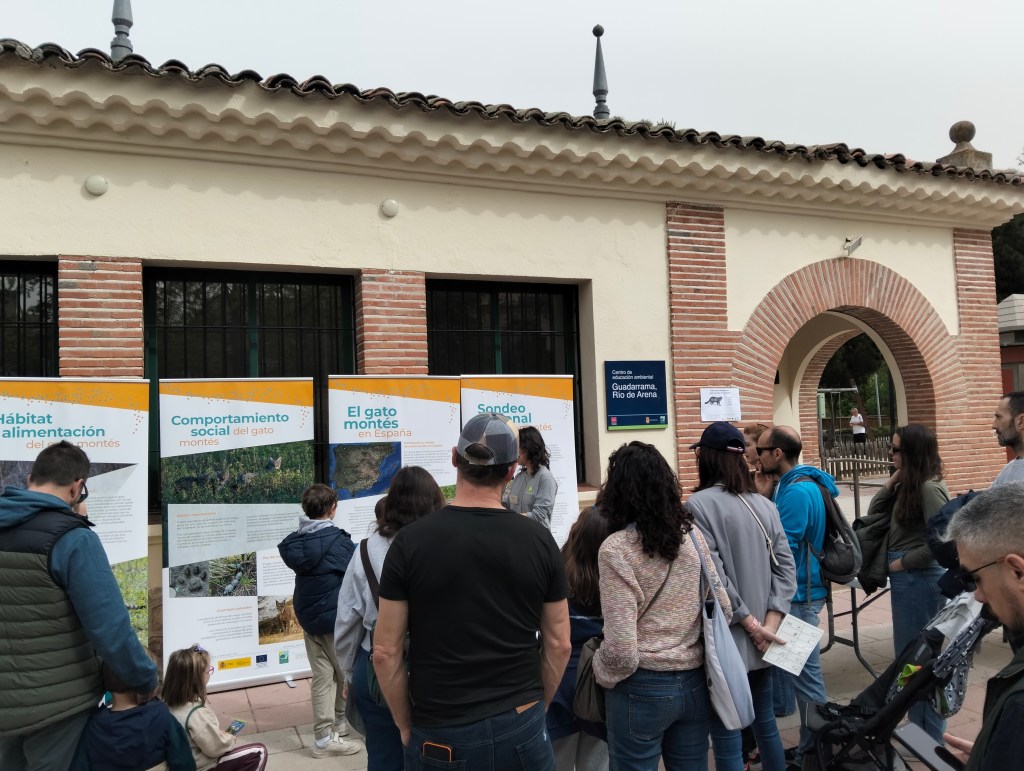 Los anfitriones realizaron una actividad sobre el sondeo nacional del gato montés (Felis silvestris) donde ellos han participado. Esta charla tuvo mucho éxito entre pequeños y mayores. Para divulgar sobre la especie y dar a conocer las amenazas a las que se enfrenta, colocaron paneles divulgativos mientras explicaban la información sobre el hábitat, alimentación, hábitos reproductivos y cual es su estado de conservación en España (si te interesan estos paneles los puedes ver en su web.) Nos también contaron cómo poder diferenciarlo, por si tenemos la suerte de ver este felino tan esquivo, de un gato doméstico y nos mostraron las imágenes de toda la fauna que han podido identificar con el uso de las cámaras de fototrampeo.
