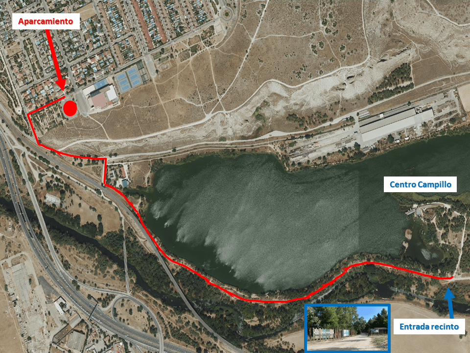 Salida 19 de la A-III. Dejar el vehículo en el aparcamiento del Polideportivo Parque del Sureste. Desde aquí caminar 2 km hasta llegar a nuestro centro. Los primeros 500 metros se realiza por el núcleo urbano de Rivas Vaciamadrid (bajar por calle Mirador y girar a la izquierda por calle de Marcial Lalanda), el resto pertenece al recorrido de la senda que rodea la laguna y transcurre entre el río Jarama y la laguna. Aproximadamente el tiempo empleado en llegar al centro son 30 minutos.