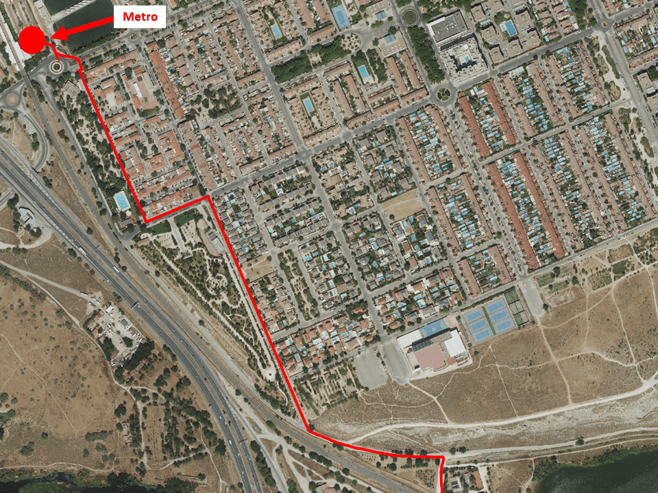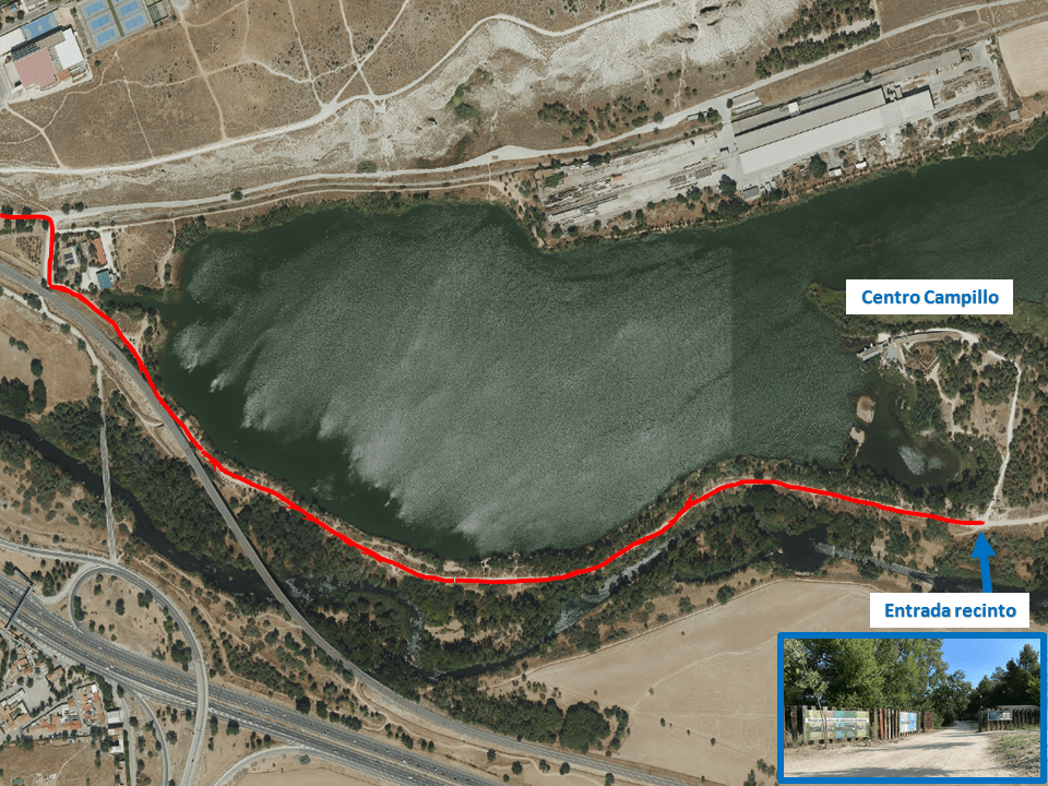 Parada «Rivas Vaciamadrid» de la línea 9 de metro.  Desde la parada, cruzar la Avenida de Francia para coger la Calle de San Isidro y recorrerla hasta final. Girar a la izquierda por calle MIralrío para luego girar a la derecha para recorrer la calle de Marcial Lalanda hasta el final. La mitad del camino se realiza por el núcleo urbano de Rivas Vaciamadrid, la otra mitad pertenece al recorrido de la senda que rodea la laguna y transcurre entre el río Jarama y la laguna.