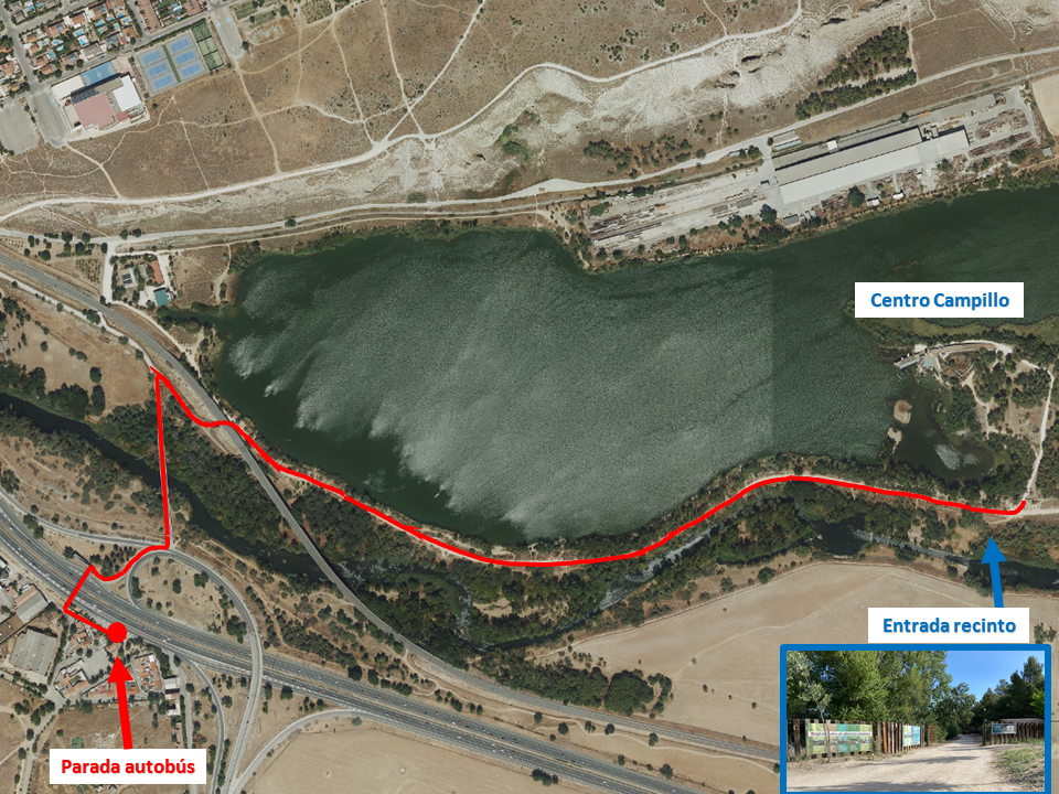 Parada «Rivas Vaciamadrid» de la línea 9 de metro.  Desde la parada, cruzar la Avenida de Francia para coger la Calle de San Isidro y recorrerla hasta final. Girar a la izquierda por calle MIralrío para luego girar a la derecha para recorrer la calle de Marcial Lalanda hasta el final. La mitad del camino se realiza por el núcleo urbano de Rivas Vaciamadrid, la otra mitad pertenece al recorrido de la senda que rodea la laguna y transcurre entre el río Jarama y la laguna.