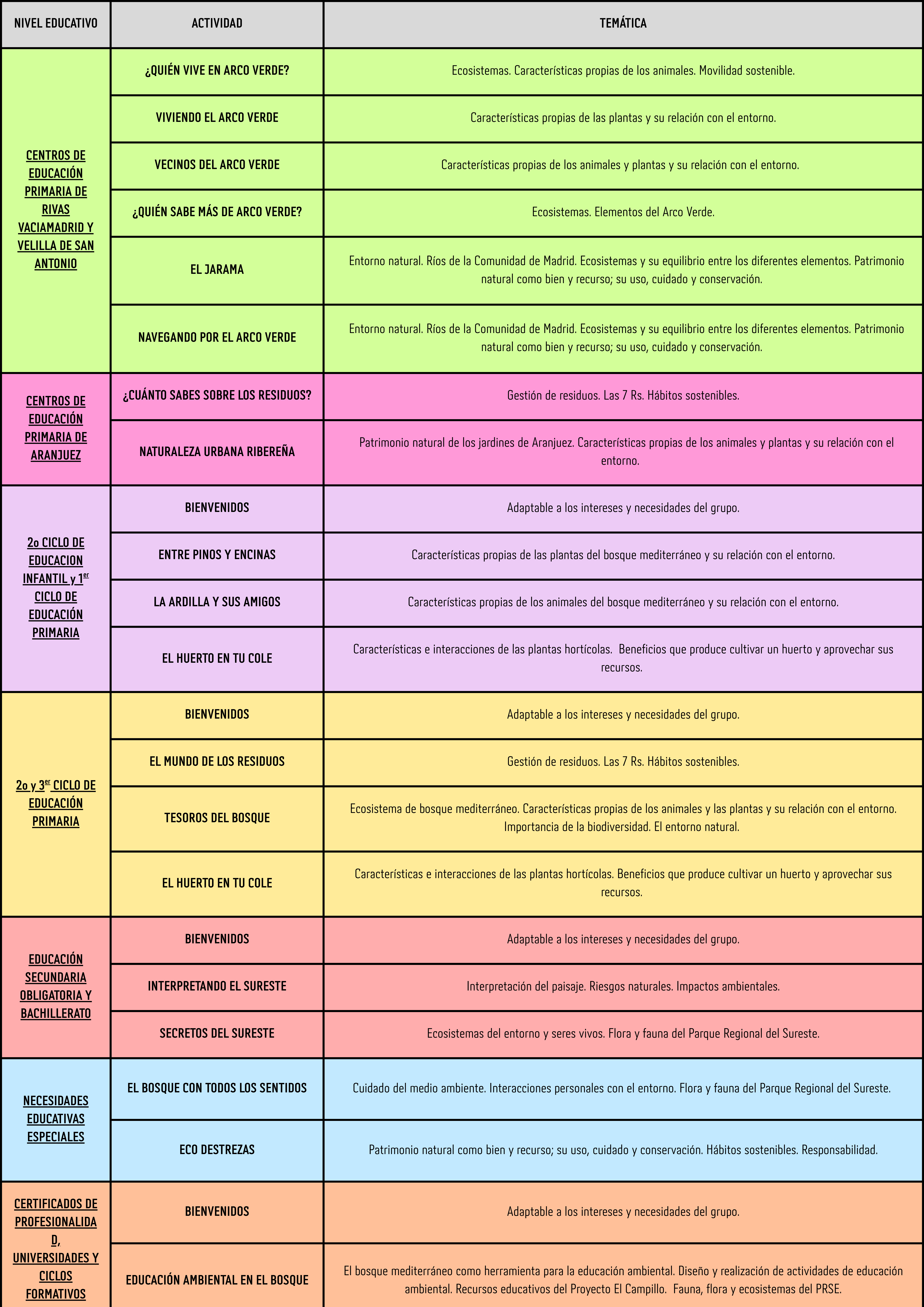 A continuación se detallan las actividades ofertadas organizadas por niveles educativos.